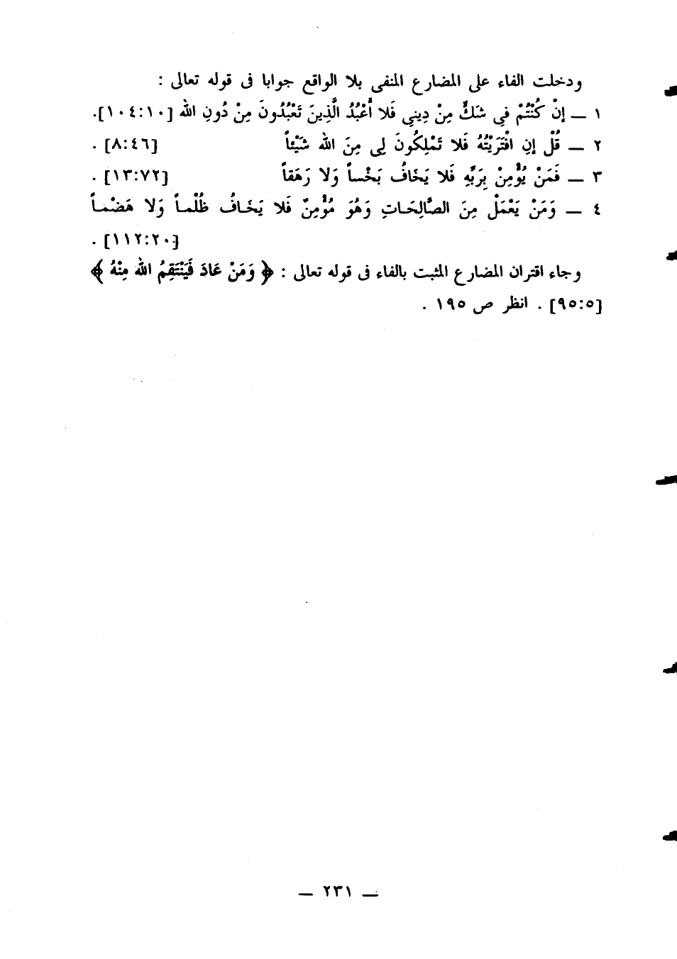 وجاء اقتران المضارع المثبت بالفاء في قوله تعالى: {ومن عاد فينتقم الله منه} [5: 95]. انظر ص 195.