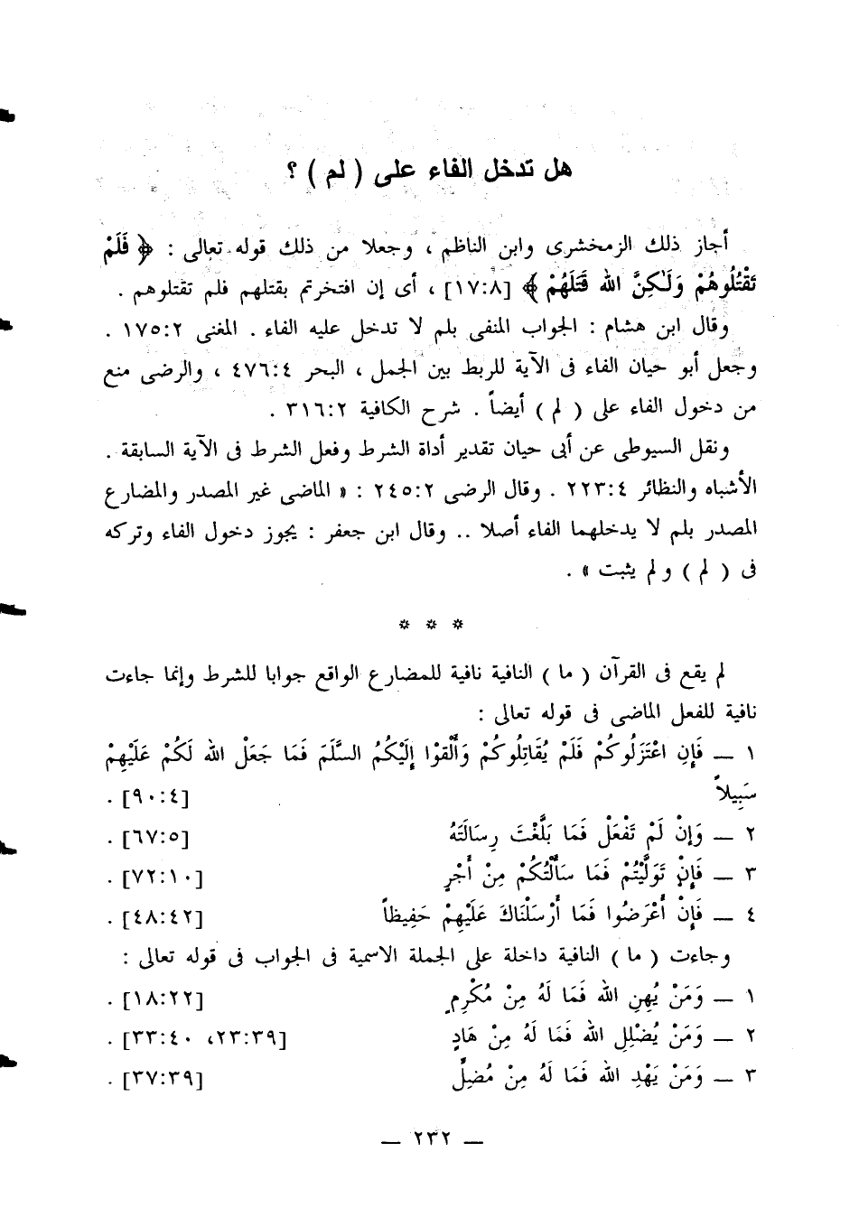 ونقل السيوطي عن أبي حيان تقدير أداة الشرط وفعل الشرط في الآية السابقة. الأشباه والنظائر 4: 223. وقال الرضي 2: 345: «الماضي غير المصدر والمضارع المصدر بلم لا يدخلهما الفاء أصلا. . . وقال ابن جعفر: يجوز دخول الفاء وتركه في (لم) ولم يثبت».