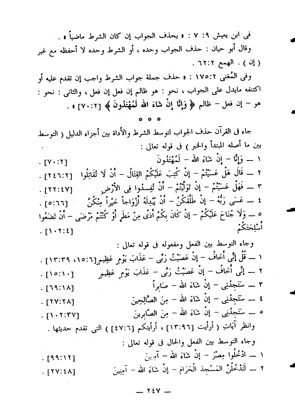 وفي المغني 2: 175: «حذف جملة جواب الشرط واجب إن تقدم عليه أو اكتنفه ما يدل على الجواب، نحو: هو ظالم إن فعل إن فعل، والثاني: نحو: هو - إن فعل - ظالم {وإنا إن شاء الله لمهتدون} [2: 70]».