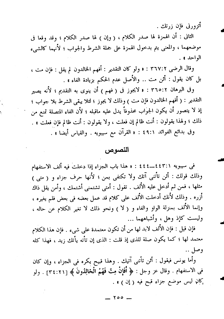 وفي البرهان 2: 365: «لا يجوز في (فهم) أن ينوي به التقديم، لأنه يصير التقدير: (أفهم الخالدون فإن مت) وذلك لا يجوز؛ لئلا يبقى الشرط بلا جواب؛ إذ لا يتصور أن يكون الجواب محذوفًا يدل عليه ما قبله؛ لأن الفاء المتصلة تمنع ذلك؛ ولهذا يقولون: أنت ظالم إن فعلت، ولا يقولون: أنت ظالم فإن فعلت».
