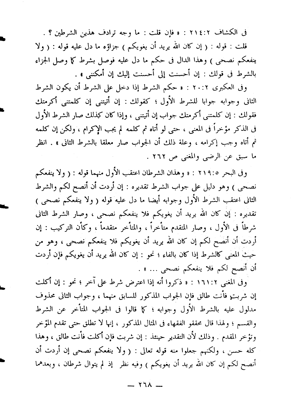 وفي المغني 2: 161: «ذكروا أنه إذا اعترض شرط على آخر؛ نحو: إن أكلت إن شربت فأنت طالق فإن الجواب المذكور للسابق منهما، وجواب الثاني محذوف مدلول عليه بالشرط الأول وجوابه؛ كما قالوا في الجواب المتأخر عن الشرط والقسم؛ ولهذا قال محققو الفقهاء في المثال المذكور، إنها لا تطلق حتى تقدم المؤخر وتؤخر المقدم. وذلك لأن التقدير حينئذ: إن شربت فإن أكلت فأنت طالق، وهذا كله حسن، ولكنهم جعلوا منه قوله تعالى: (ولا ينفعكم نصحي إن أردت أن أنصح لكم إن كان الله يريد أن يغويكم) وفيه نظر إذ لم يتوال شرطان، وبعدهما
