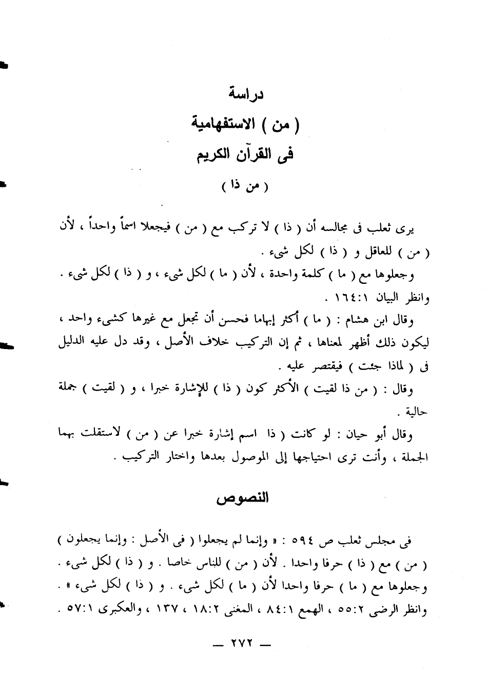 في مجلس ثعلب ص 594: «وإنما لم يجعلوا (في الأصل: وإنما يجعلون) (من) مع (ذا) حرفا واحدا. لأن (من) للناس خاصا. و (ذا) لكل شيء. وجعلوها مع (ما) حرفا واحدا لأن (ما) لكل شيء. و (ذا) لكل شيء».