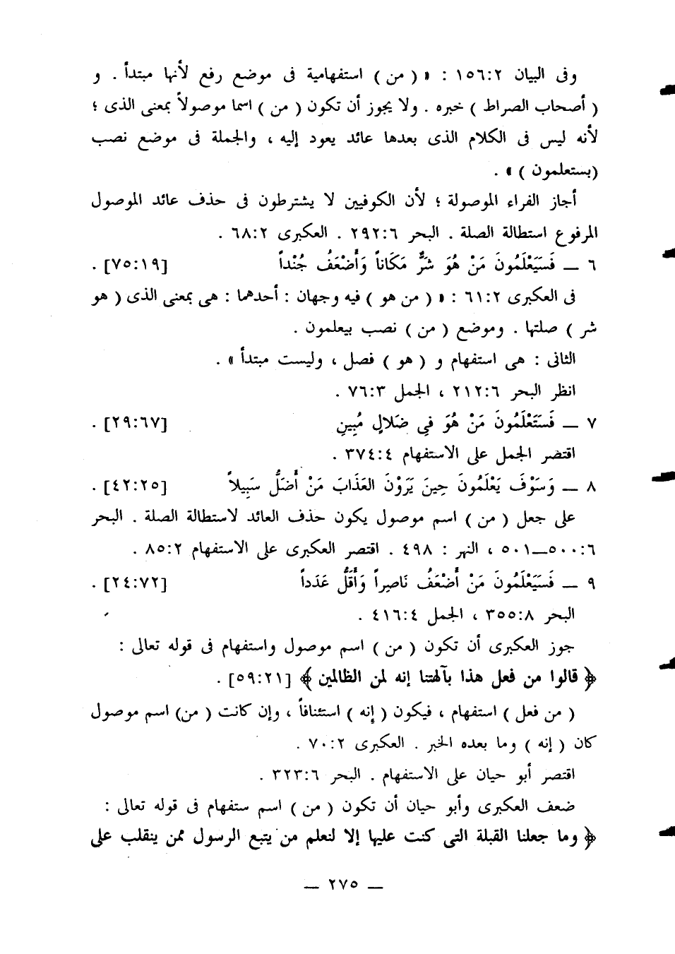 وفي البيان 2: 165: «(من) استفهامية في موضع رفع لأنها مبتدأ. و (أصحاب الصراط) خبره. ولا يجوز أن تكون (من) اسما موصولا بمعنى الذي؛ لأنه ليس في الكلام الذي بعدها عائد يعود إليه، والجملة في موضع نصب (يستعلمون)».