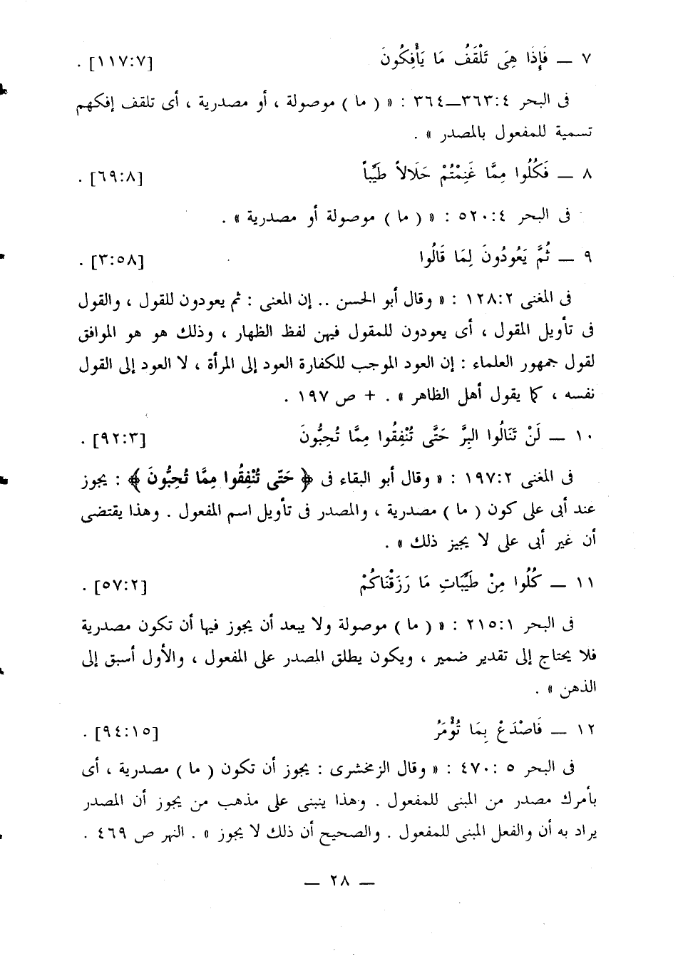 في المغني 2: 197: «وقال أبو البقاء في {حتى تنفقوا مما تحبون}: يجوز عند أبي على كون (ما) مصدرية، والمصدر في تأويل اسم المفعول. وهذا يقتضى أن غير أبي على ذلك يجيز ذلك».