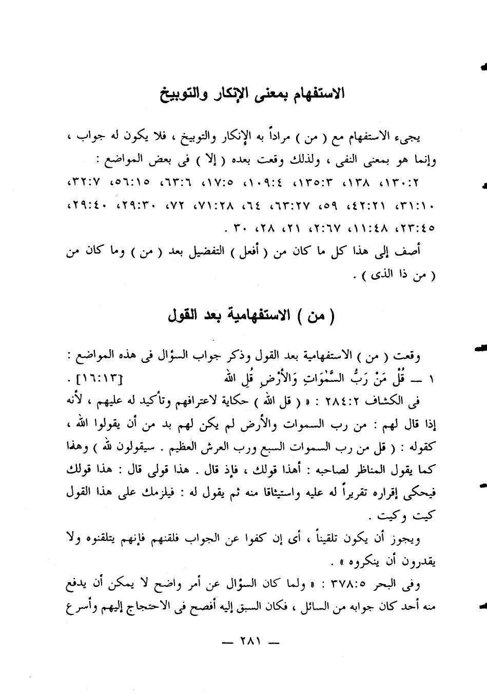 في الكشاف 2: 284: «(قل الله) حكاية لاعترافهم وتأكيد له عليهم، لأنه إذا قال لهم: من رب السموات والأرض لم يكن لهم بد من أن يقولوا الله، كقوله: (قل من رب السموات السبع ورب العرش العظيم. سيقولون الله) وهذا كما يقول المناظر لصاحبه: أهذا قولك، فإذا قال: هذا قولي قال: هذا قولك فيحكي إقراره تقريرًا له عليه واستياقا منه ثم يقول له: فيلزمك على هذا القول كيت وكيت.