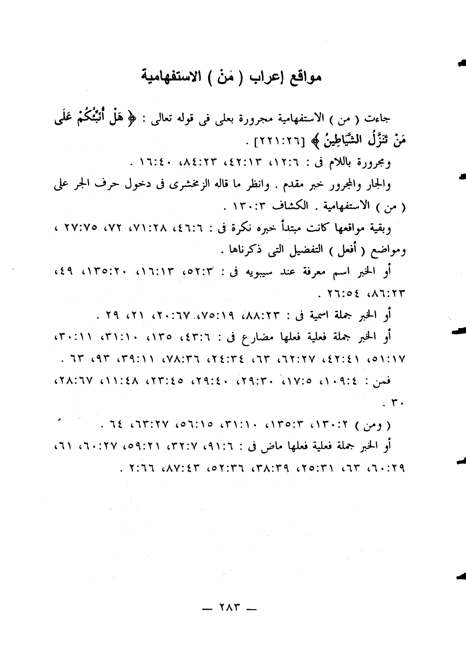 أو الخبر جملة فعلية فعلها مضارع في: 6: 43، 135، 10: 31، 11: 30، 17: 51، 41: 42، 27: 62، 63، 34: 24، 36: 78، 11: 39، 93، 63.