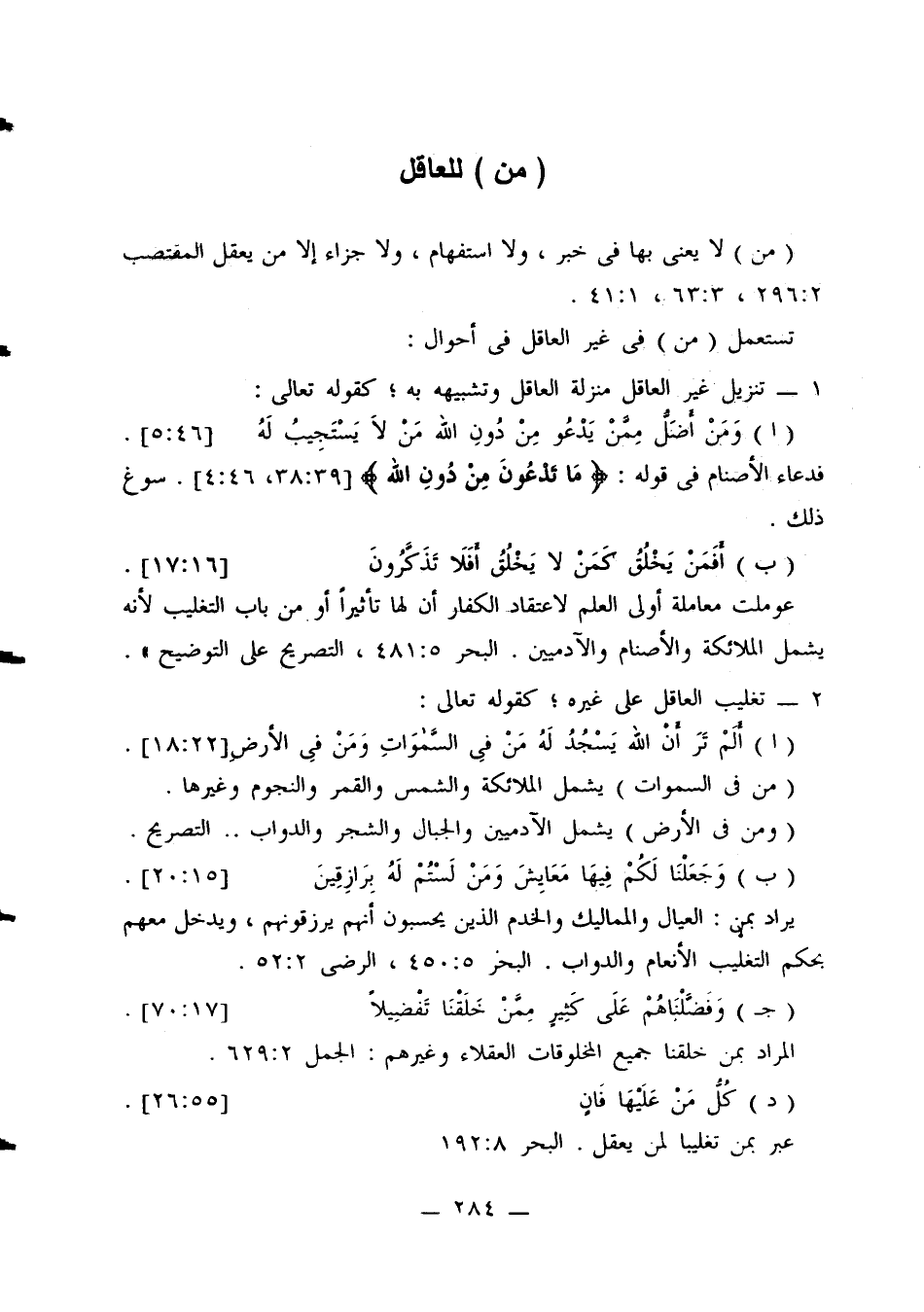 (من) لا يعني بها في خبر، ولا استفهام، ولا جزاء إلا من يعقل المقتضب 2: 296، 3: 63، 1: 41.