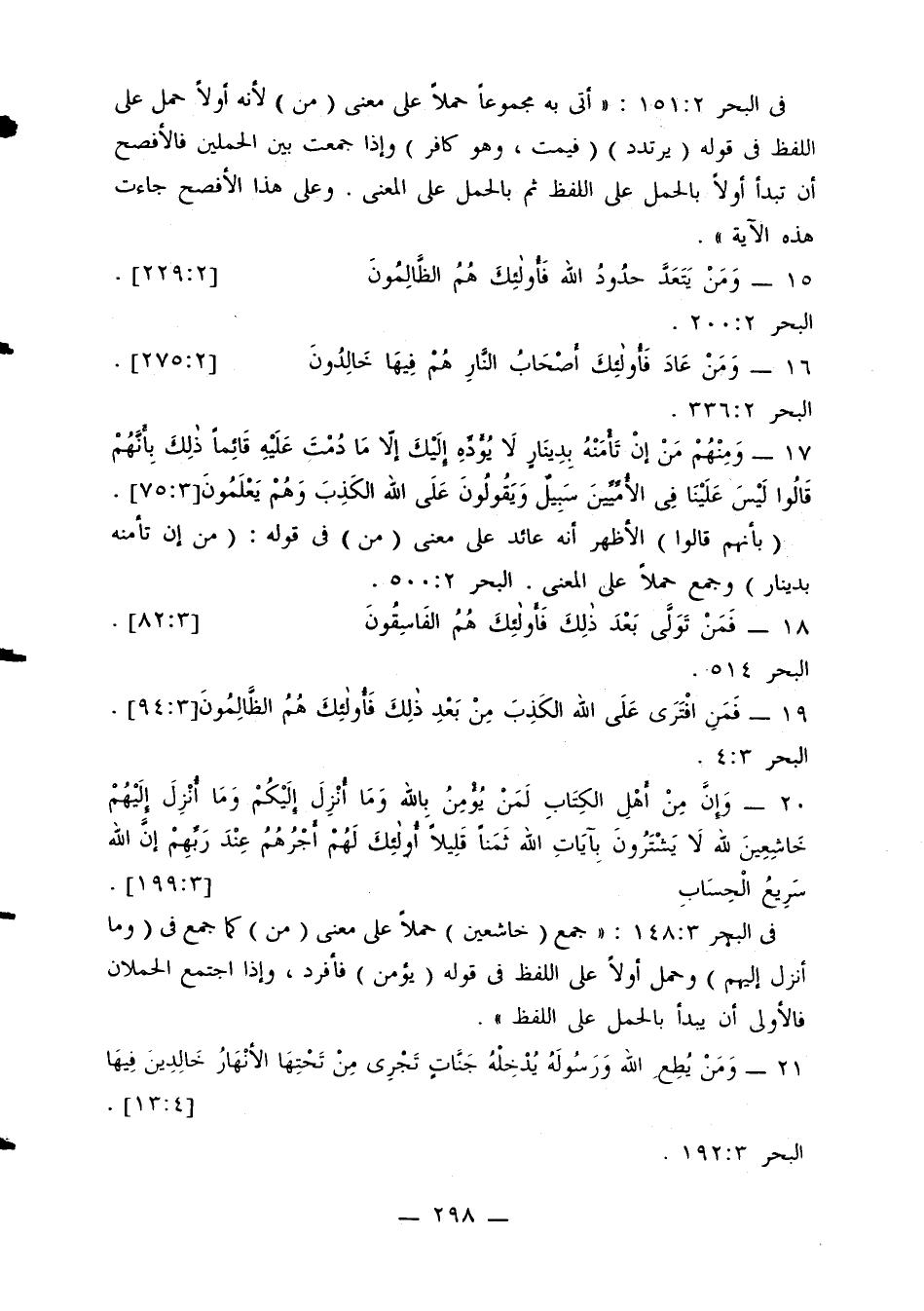 في البحر 3: 148: «جمع (خاشعين) حملاً على معنى (من) كما جمع في (وما أنزل إليهم) وحمل أولاً على اللفظ في قوله (يؤمن) فأفرد، وإذا اجتمع الحملان فالأولى أن يبدأ بالحمل على اللفظ».