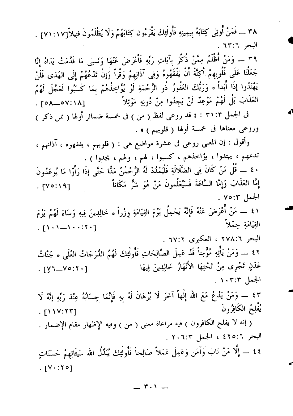 في الجمل 3: 31: «قد روعى لفظ (من) في خمسة ضمائر أولها (ممن ذكر) وروعى معناها في خمسة أولها (قلوبهم)».