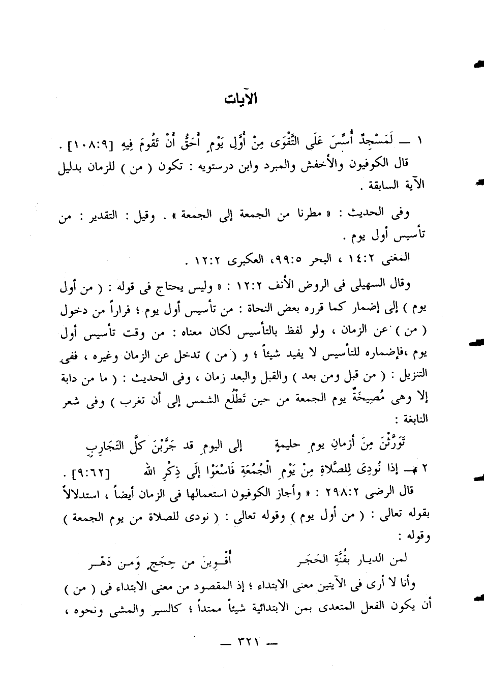 وقال السهيلي في الروض الأنف 2: 12: «وليس يحتاج في قوله: (من أول يوم) إلى إضمار كما قرره بعض النحاة: من تأسيس أول يوم؛ فرارًا من دخول (من) عن الزمان، ولو لفظ بالتأسيس لكان معناه: من وقت تأسيس أول يوم، فإضماره للتأسيس لا يفيد شيئًا؛ و (من) تدخل عن الزمان وغيره، ففي التنزيل: (من قبل ومن بعد) والقبل والبعد زمان، وفي الحديث: (ما من دابة إلا وهي مصيخة يوم الجمعة من حين تطلع الشمس إلى أن تغرب) وفي شعر النابغة: