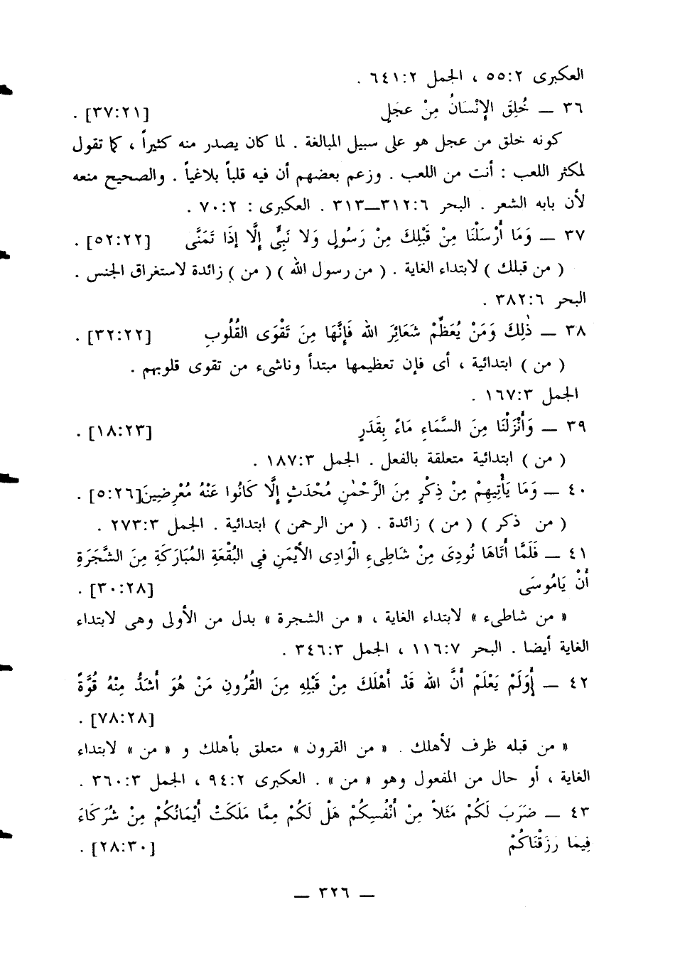 كونه خلق من عجل هو على سبيل المبالغة. لما كان يصدر منه كثيرًا، كما تقول لمكثر اللعب: أنت من اللعب. وزعم بعضهم أن فيه قلبا بلاغيًا. والصحيح منعه لأن بابه الشعر. البحر 6: 312 - 313. العكبري: 2: 70.