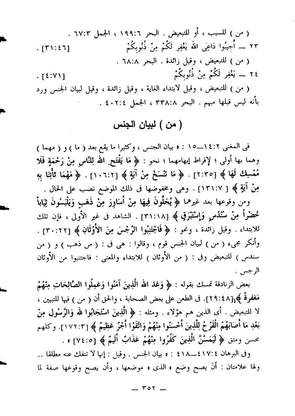 في المغني 2: 14 - 15: «بيان الجنس، وكثيرا ما يقع بعد (ما) و (مهما) وهما بها أولى؛ لإفراط إبهامها؛ نحو: {ما يفتح الله للناس من رحمة فلا ممسك لها} [35: 3]. {ما ننسخ من آية} [2: 106]. {مهما تأتنا به من آية} [7: 131]. وهي ومخفوضها في ذلك الموضع نصب على الحال.