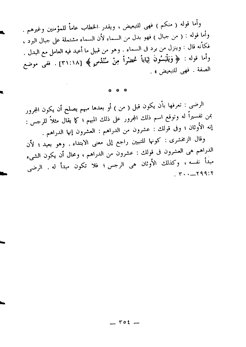 وقال الزمخشري: كونها للتبيين راجع إلى معنى الابتداء. وهو بعيد؛ لأن الدراهم هي العشرون في قولك: عشرون من الدراهم، ومحال أن يكون الشيء مبدأ نفسه، وكذلك الأوثان هي الرجس؛ فلا تكون مبدأ له. الرضي 2: 299 - 300.