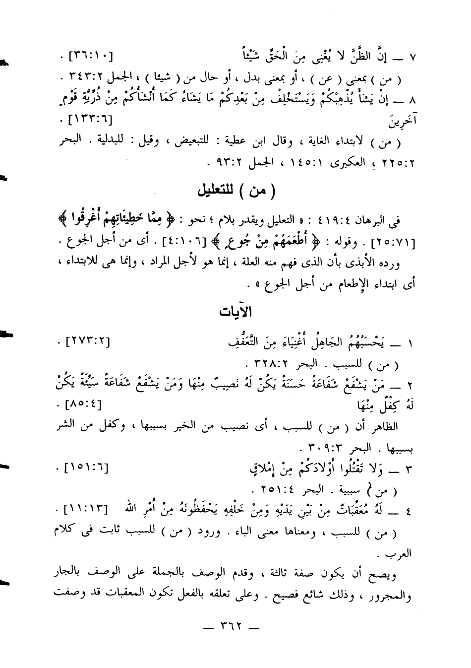 في البرهان 4: 419: «التعليل ويقدر بلام؛ نحو: {مما خطيئاتهم أغرقوا} [71: 25]. وقوله: {أطعمهم من جوع} [106: 4]. أي من أجل الجوع.
