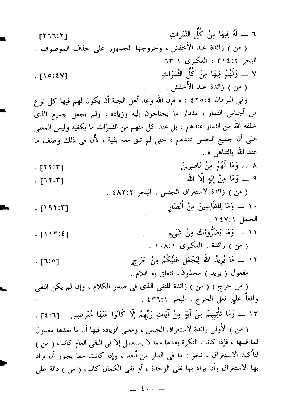 وفي البرهان 4: 425: «فإن الله وعد أهل الجنة أن يكون لهم فيها كل نوع من أجناس الثمار، مقدار ما يحتاجون إليه وزيادة، ولم يجعل جميع الذي خلقه الله من الثمار عندهم، بل عند كل منهم من الثمرات ما يكفيه وليس المعنى على أن جميع الجنس عندهم، حتى لم تبق معه بقية، لأن في ذلك وصف ما عند الله بالتناهي».