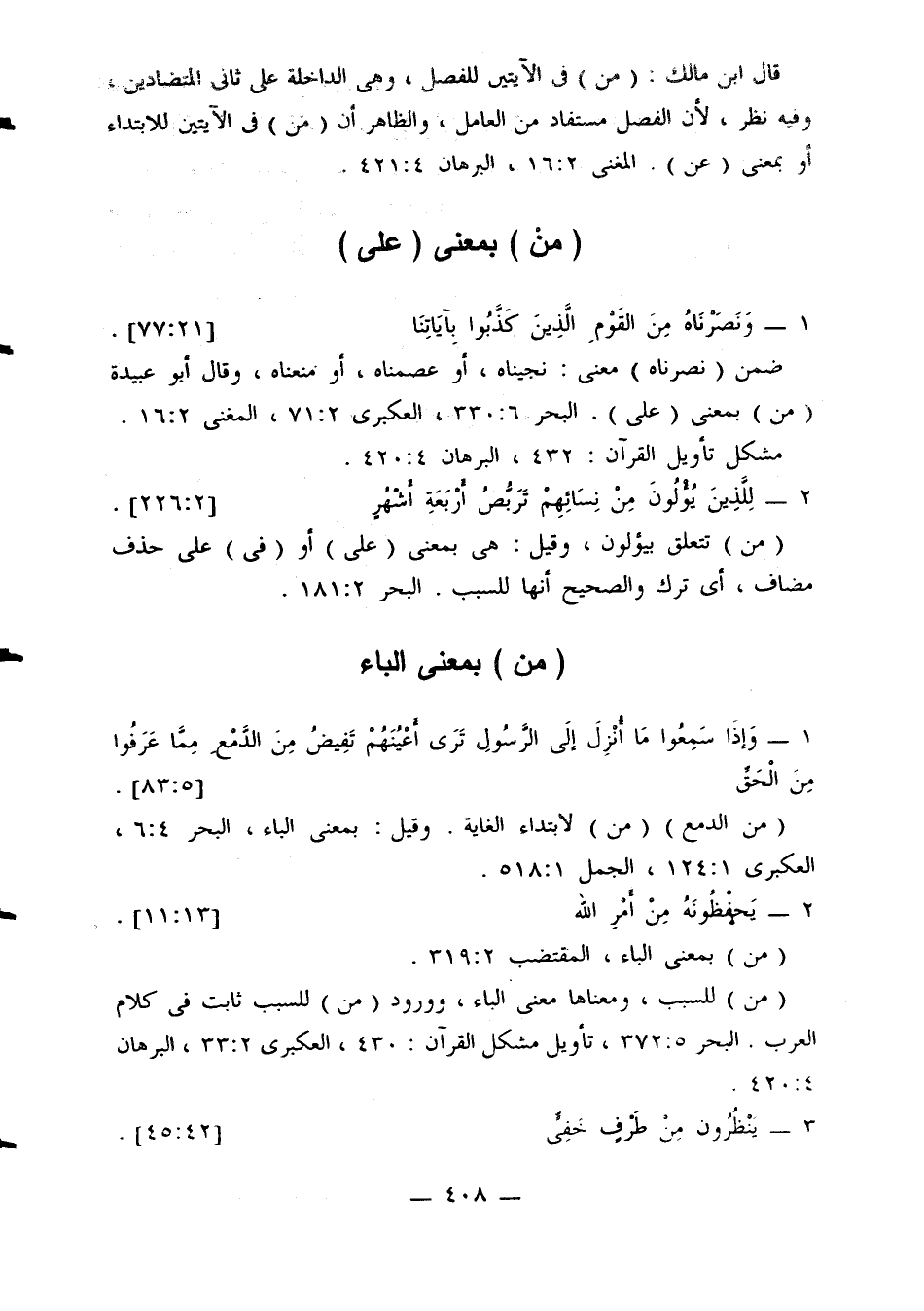 قال ابن مالك: (من) في الآيتين للفصل، وهي الداخلة على ثاني المتضادين، وفيه نظر، لأن الفصل مستفاد من العامل، والظاهر أن (من) في الآيتين للابتداء أو بمعنى (عن). المغني 2: 16، البرهان 4: 421.