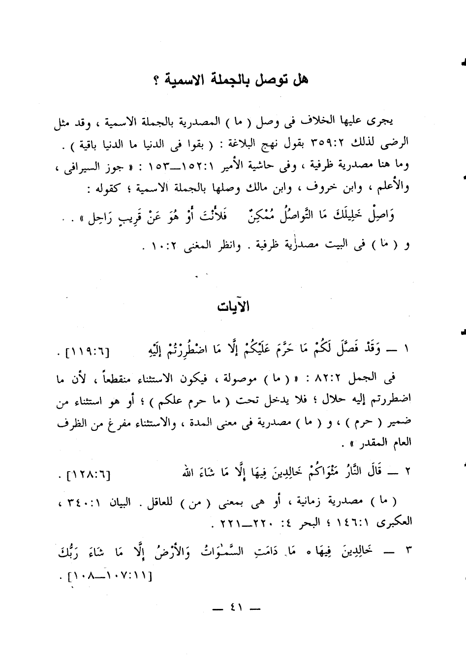 يجرى عليها الخلاف في وصل (ما) المصدرية بالجملة الاسمية، وقد مثل الرضي لذلك 2: 359 بقول نهج البلاغة: «بقوا في الدنيا ما الدنيا باقية». وما هنا مصدرية ظرفية، وفي حاشية الأمير 1: 152 - 153: «جوز السيرافي، والأعلم، وابن خروف، وابن مالك وصلها بالجملة الاسمية؛ كقوله: