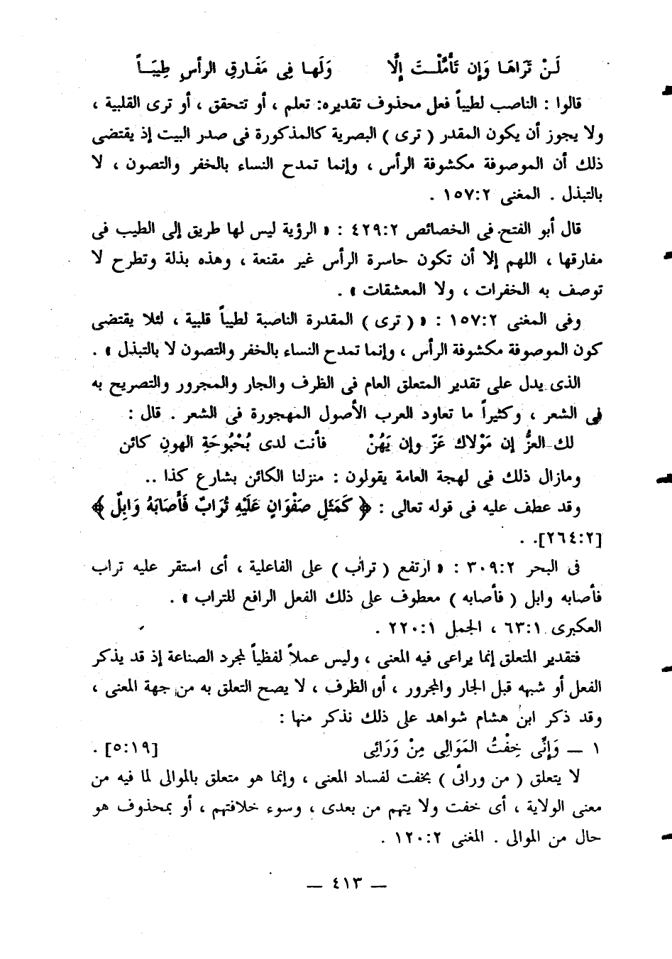 وفي المغني 2: 157: «(ترى) المقدرة الناصبة لطيبًا قلبية، لئلا يقتضي كون الموصوفة مكشوفة الرأس، وإنما تمدح النساء بالخفر والتصون لا بالتبذل».