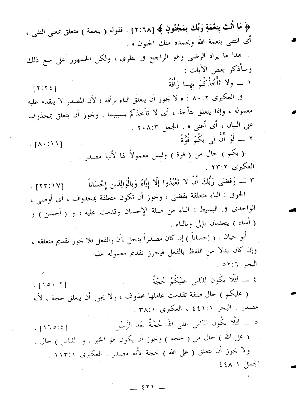 {ما أنت بنعمة ربك بمجنون} [68: 2]. فقوله (بنعمة) متعلق بمعنى النفي، أي انتفى بنعمة الله وبحمده منك الجنون».