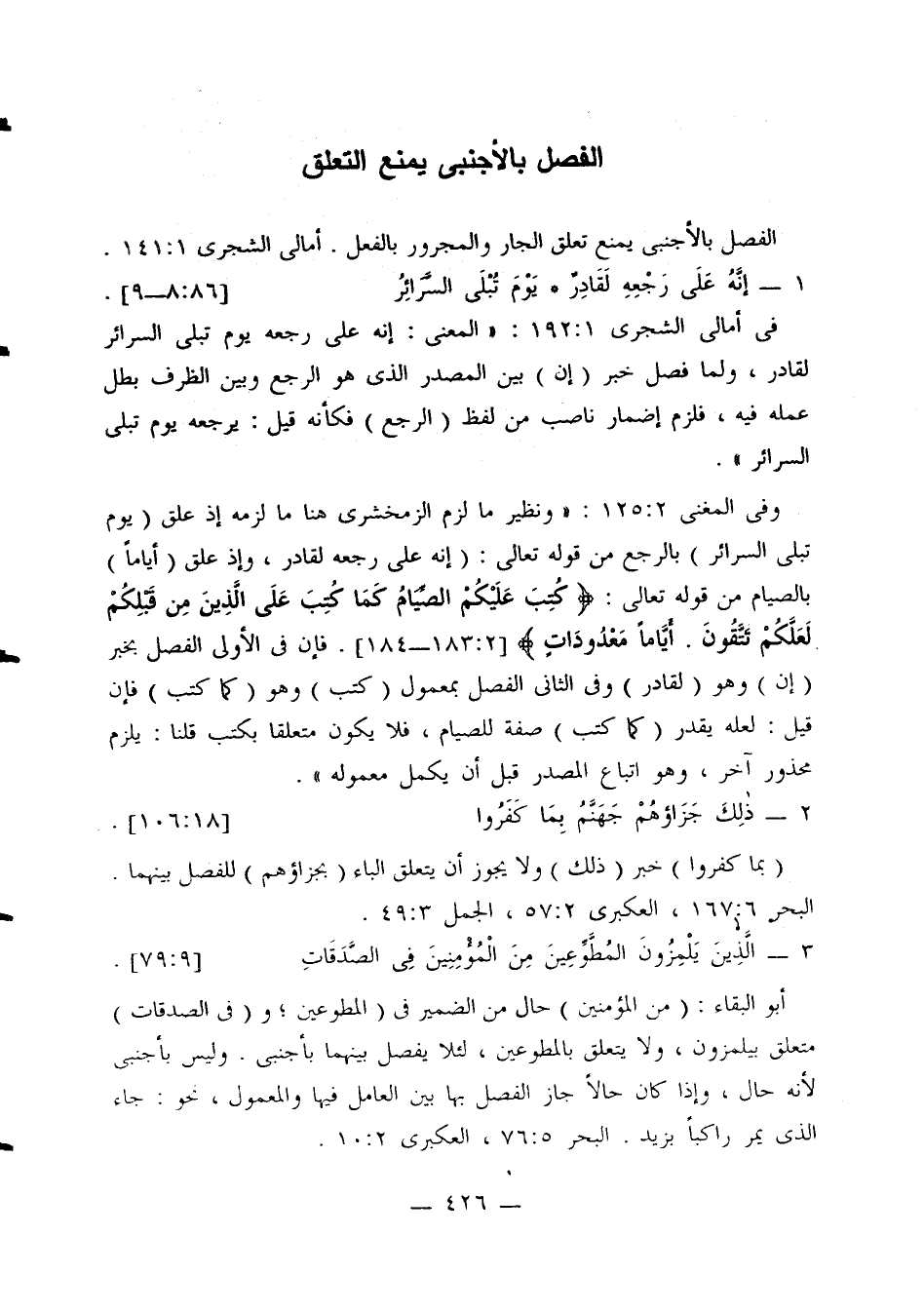 وفي المغني 2: 125: «ونظير ما لزم الزمخشري هنا ما لزمه إذ علق (يوم تبلى السرائر) بالرجع من قوله تعالى: (إنه على رجعه لقادر، وإذ علق (أيامًا) بالصيام من قوله تعالى: {كتب عليكم الصيام كما كتب على الذين من قبلكم لعلكم تتقون. أياما معدودات} [2: 183 - 184]. فإن في الأولى الفصل بخبر (إن) وهو (لقادر) وفي الثاني الفصل بمعمول (كتب) وهو (كما كتب) فإن قبل: لعله يقدر (كما كتب) صفة للصيام، فلا يكون متعلقا بكتب قلنا: يلزم محذور آخر، وهو اتباع المصدر قبل أن يكمل معموله».