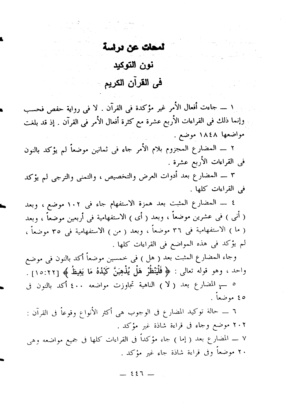 4 - المضارع المثبت بعد همزة الاستفهام جاء في 102 موضع، وبعد (أنى) في عشرين موضعًا، وبعد (أي) الاستفهامية في أربعين موضعًا، وبعد (ما) الاستفهامية في 36 موضعًا، وبعد (من) الاستفهامية في 35 موضعًا، لم يؤكد في هذه المواضع في القراءات كلها.