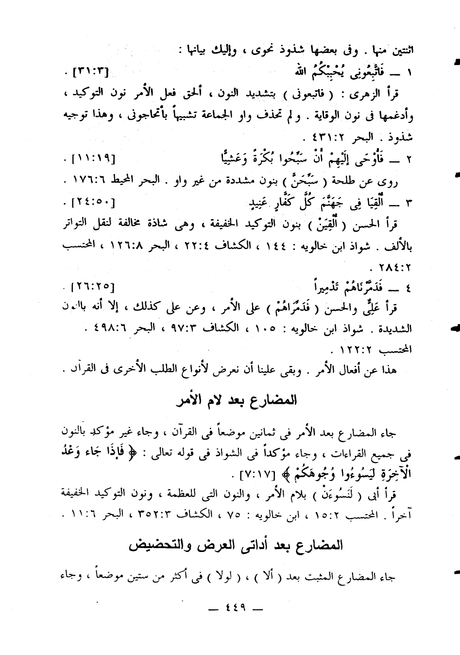جاء المضارع بعد الأمر في ثمانين موضعا في القرآن، وجاء غير مؤكد بالنون في جميع القراءات، وجاء مؤكدًا في الشواذ في قوله تعالى: {فإذا جاء وعد الآخرة ليسوءوا وجوهكم} [17: 7].
