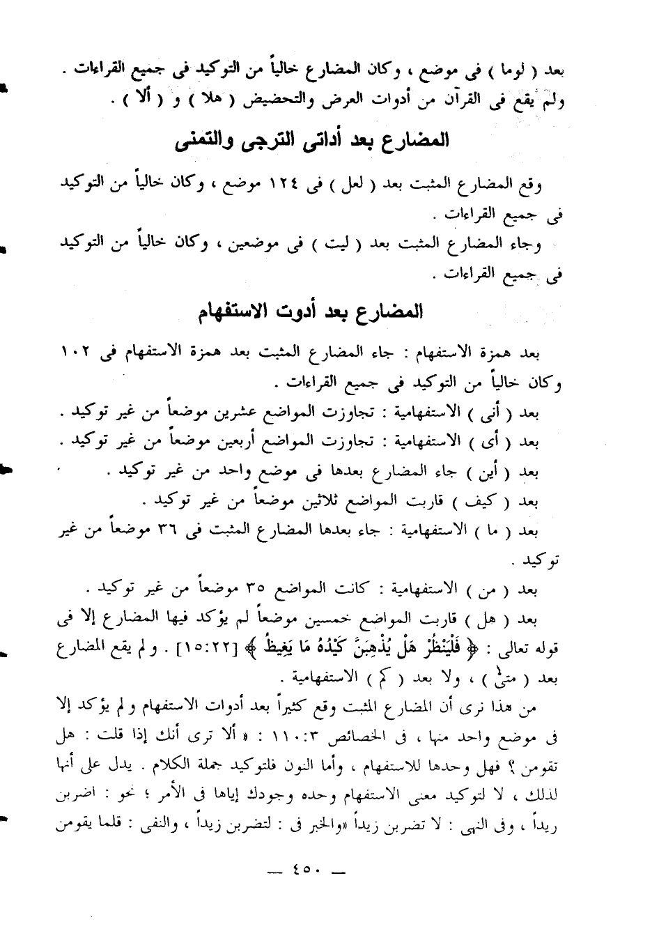 بعد (هل) قاربت المواضع خمسين موضعا لم يؤكد فيها المضارع إلا في قوله تعالى: {فلينظر هل يذهبن كيده ما يغيظ} [22: 15]. ولم يقع المضارع بعد (متى)، ولا بعد (كم) الاستفهامية.