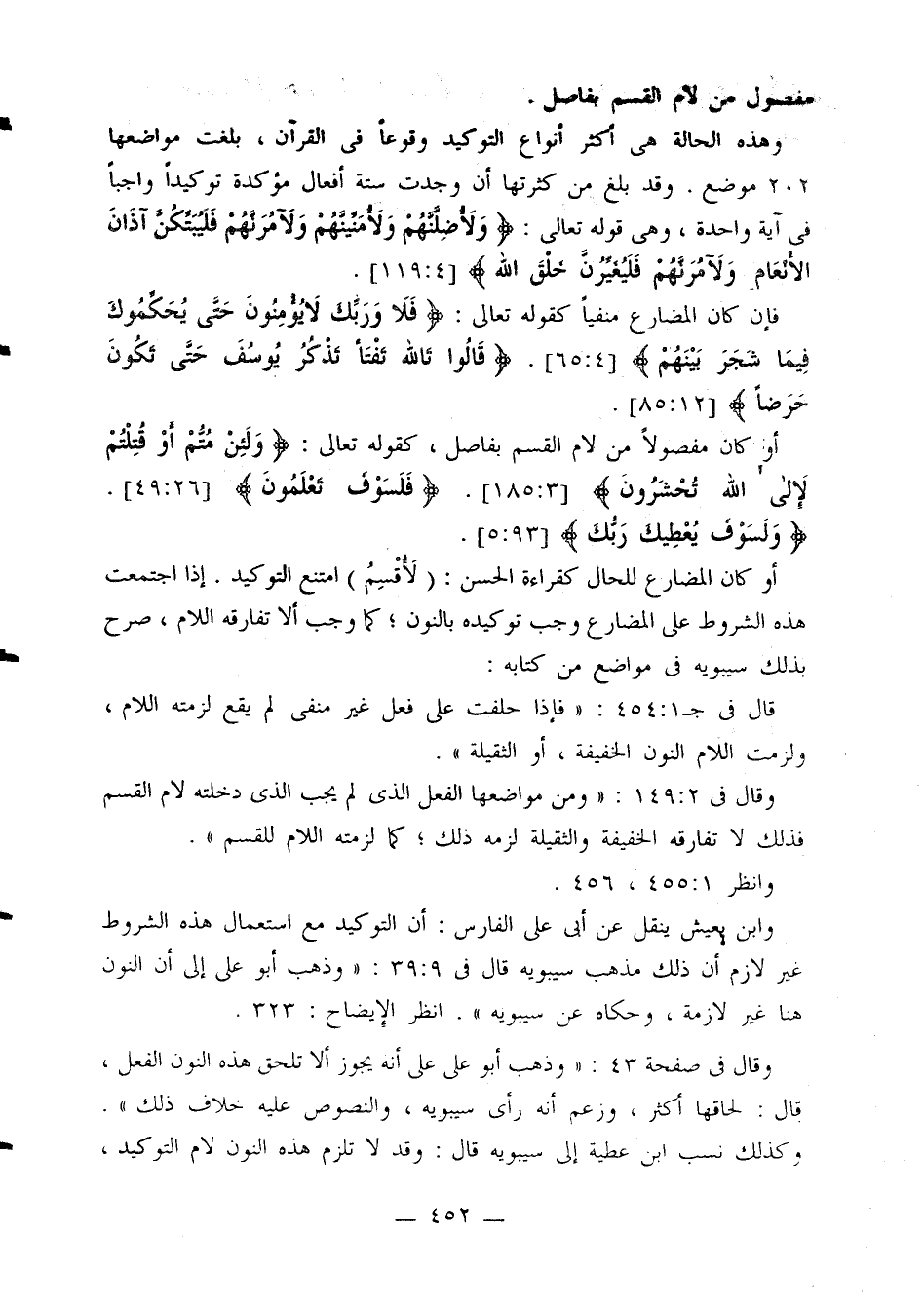 وقال في صفحة 43: «وذهب أبو علي على أنه يجوز ألا تلحق هذه النون الفعل، قال: لحاقها أكثر، وزعم أنه رأى سيبويه، والنصوص عليه خلاف ذلك».