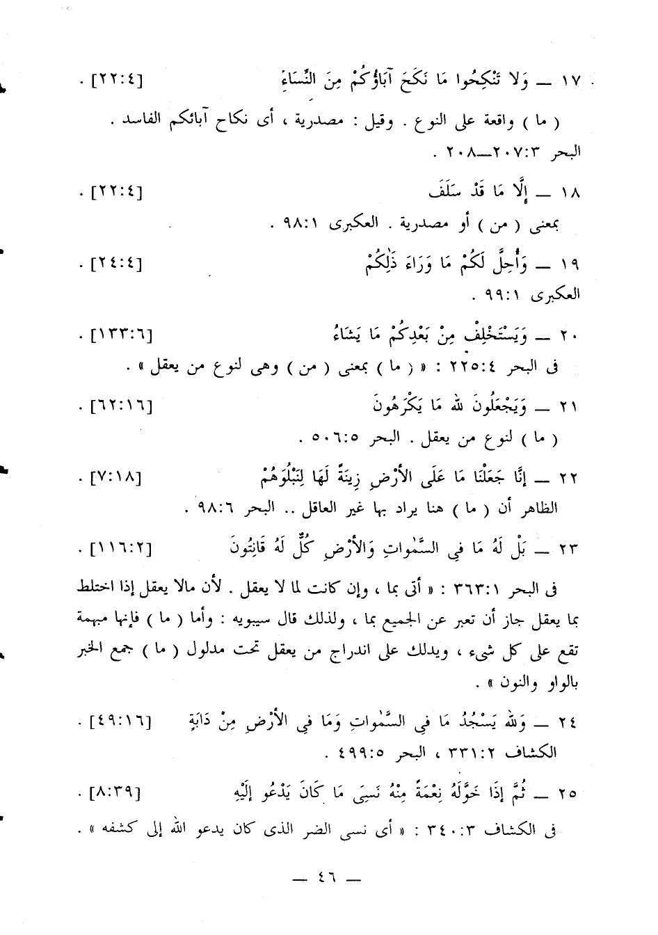 22 - {إنا جعلنا ما على الأرض زينة لهم لنبلوهم} [18: 7]. الظاهر أن (ما) هنا يراد بها غير العاقل. . . البحر 6: 98.