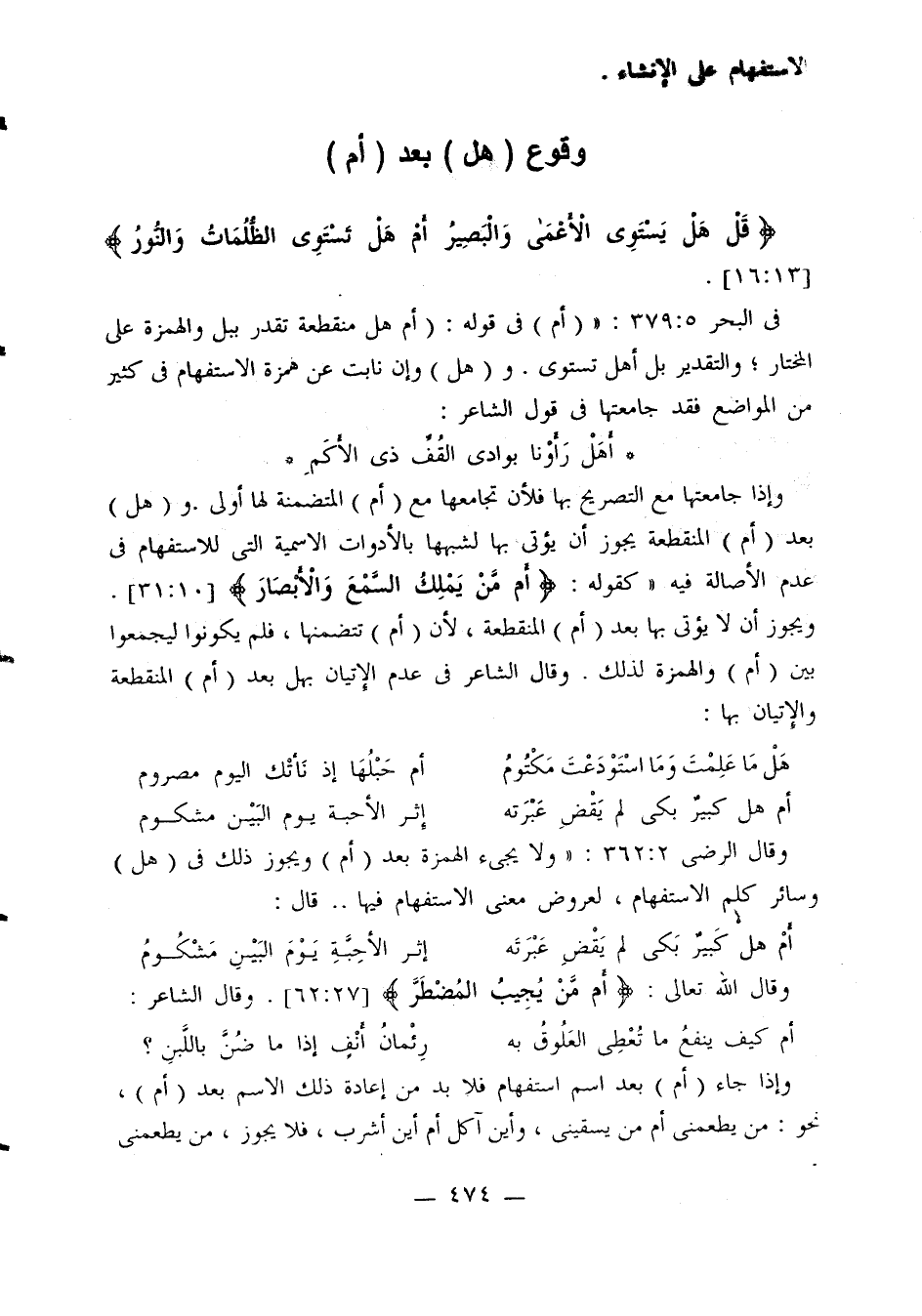 في البحر 5: 379: «(أم) في قوله: (أم هل منقطعة تقدر ببل والهمزة على المختار؛ والتقدير بل أهل تستوى. و (هل) وإن نابت عن همزة الاستفهام في كثير من المواضع فقد جامعتها في قول الشاعر: