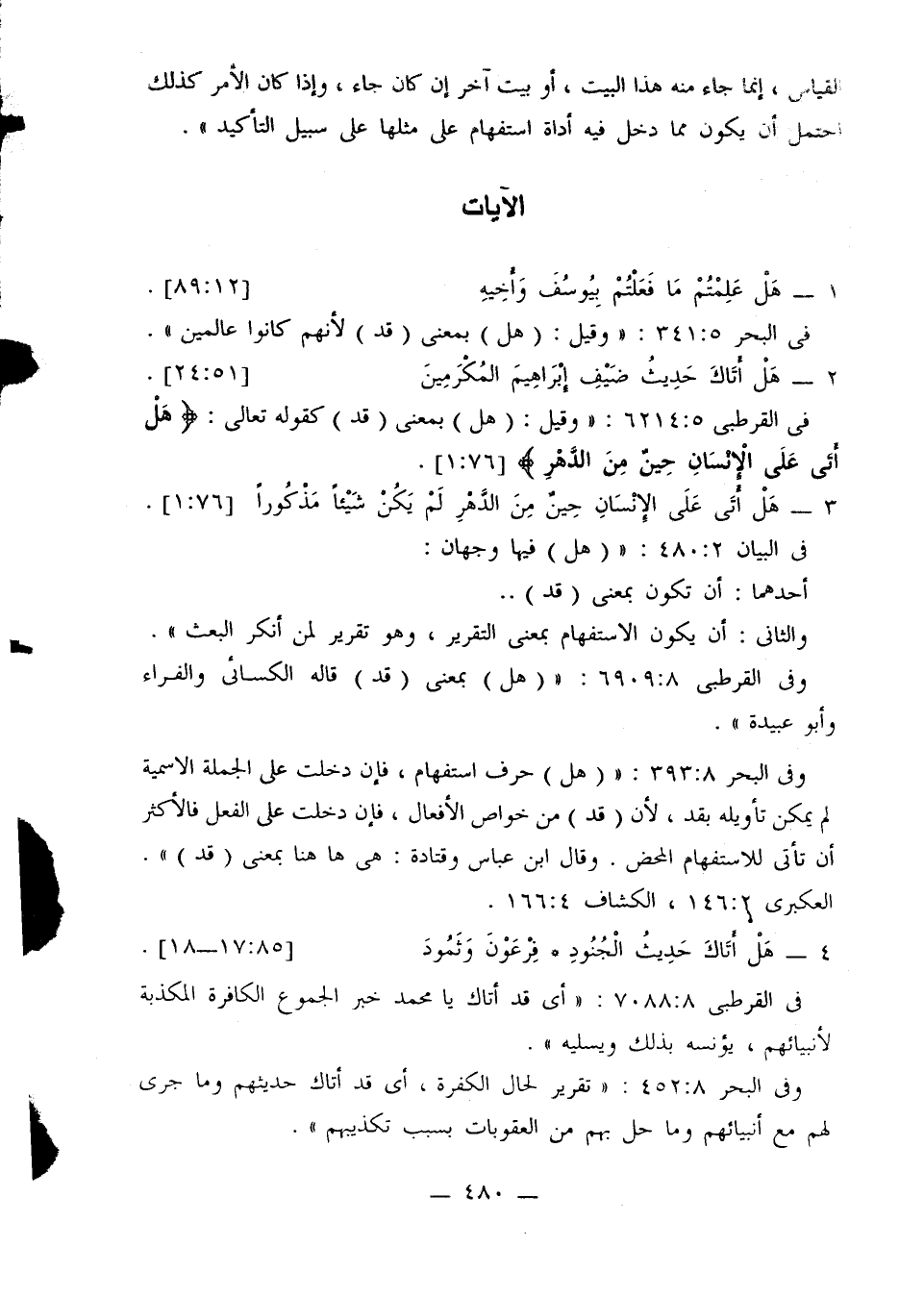 في القرطبي 5: 6214: «وقيل: (هل) بمعنى (قد) كقوله تعالى: {هل أتى على الإنسان حين من الدهر} [76: 1]».