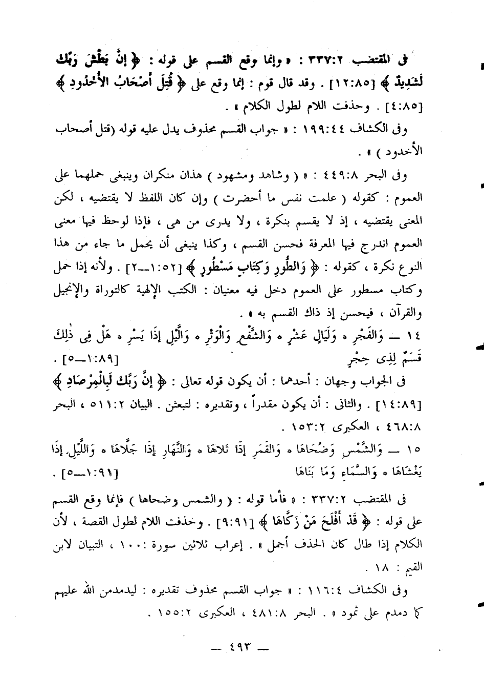 في المقتضب 2: 337: «وإنما وقع القسم على قوله: {إن بطش ربك لشديد} [85: 12]. وقد قال قوم: إنما وقع على {قتل أصحاب الأخدود} [85: 4]. وحذفت اللام لطول الكلام».