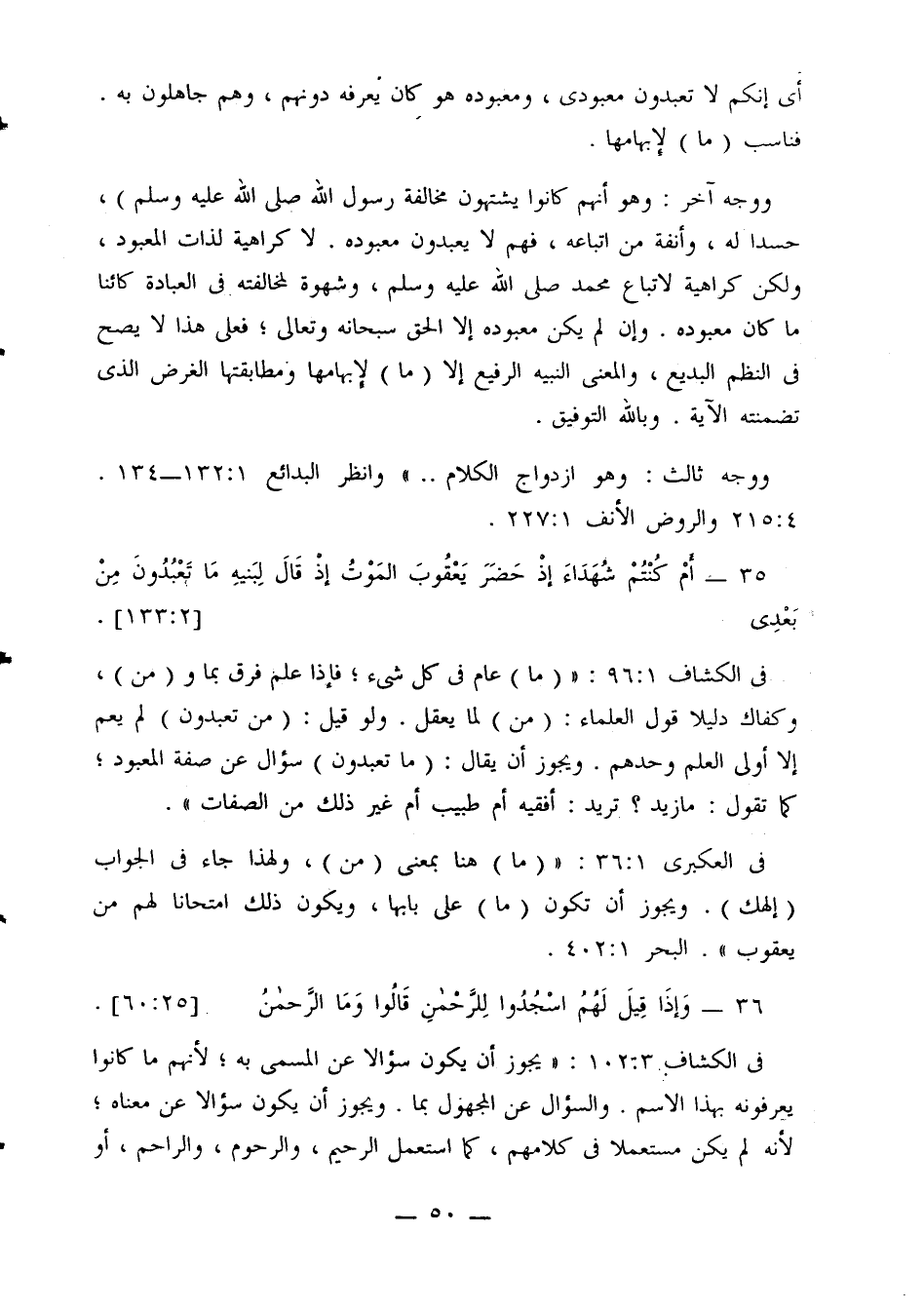 في الكشاف 1: 96: «(ما) عام في كل شيء؛ فإذا علم فرق بما و (من)، وكفاك دليلا قول العلماء: (من) لما يعقل، ولو قيل: (من تعبدون) لم يعم إلا أولى العلم وحدهم، ويجوز أن يقال: (ما تعبدون) سؤال عن صفة المعبود؛ كما تقول: ما زيد؟ تريد: أفقيه أم طبيب أم غير ذلك من الصفات».