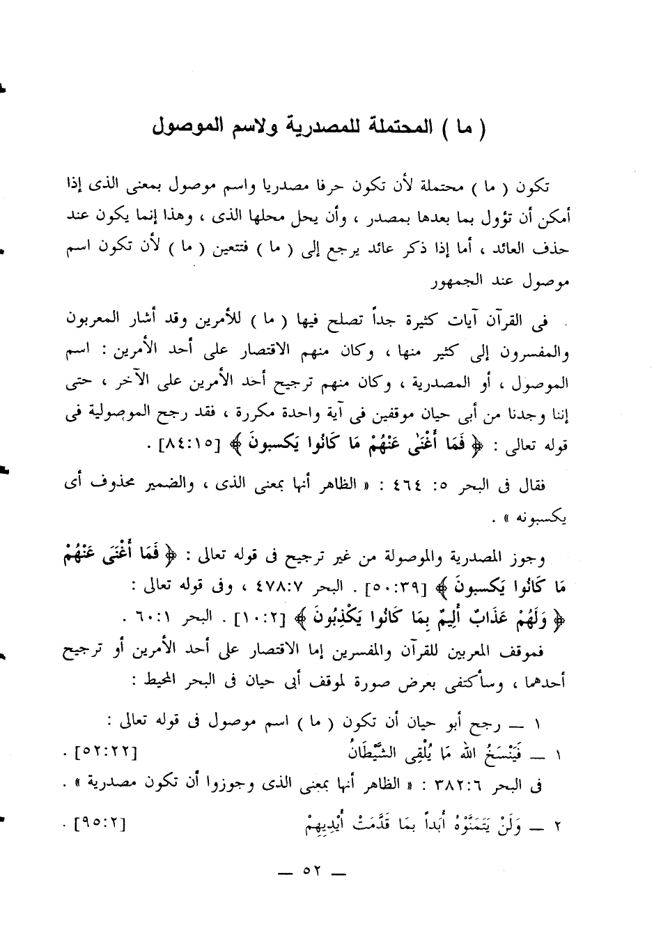 وجوز المصدرية والموصولة من غير ترجيح في قوله تعالى: {فما أغنى عنهم ما كانوا يكسبون} [39: 50]. البحر 7: 478، وفي قوله تعالى: {ولهم عذاب إليم بما كانوا يكذبون} [2: 10]. البحر 1: 60.