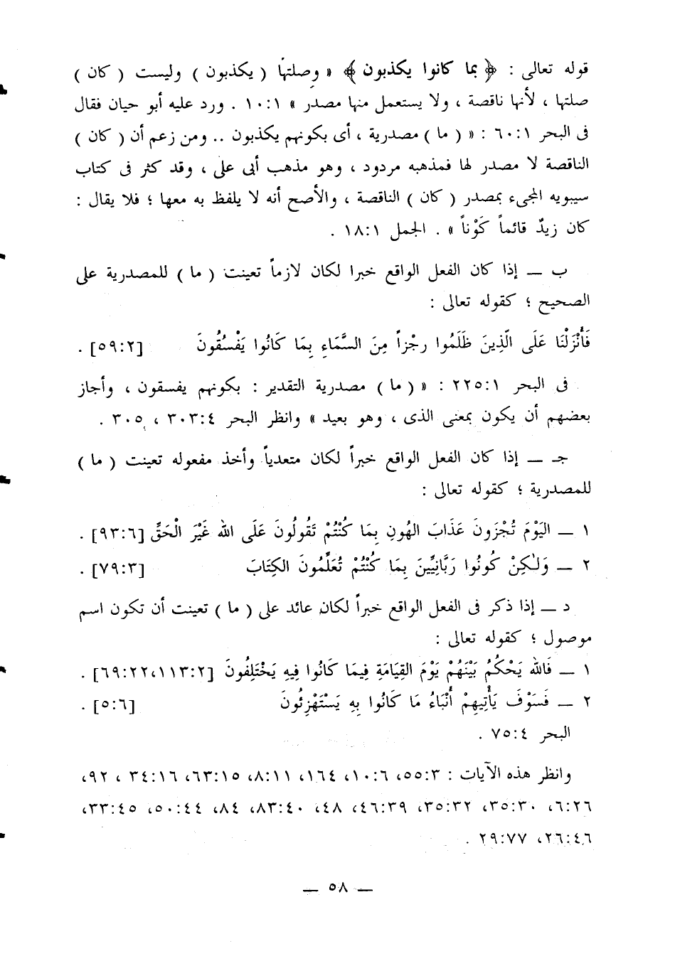 ب إذا كان الفعل الواقع خبرا لكان لازما تعينت (ما) للمصدرية على الصحيح؛ كقوله تعالى: {فأنزلنا على الذين ظلموا رجزا من السماء بما كانوا يفسقون} [2: 59].
