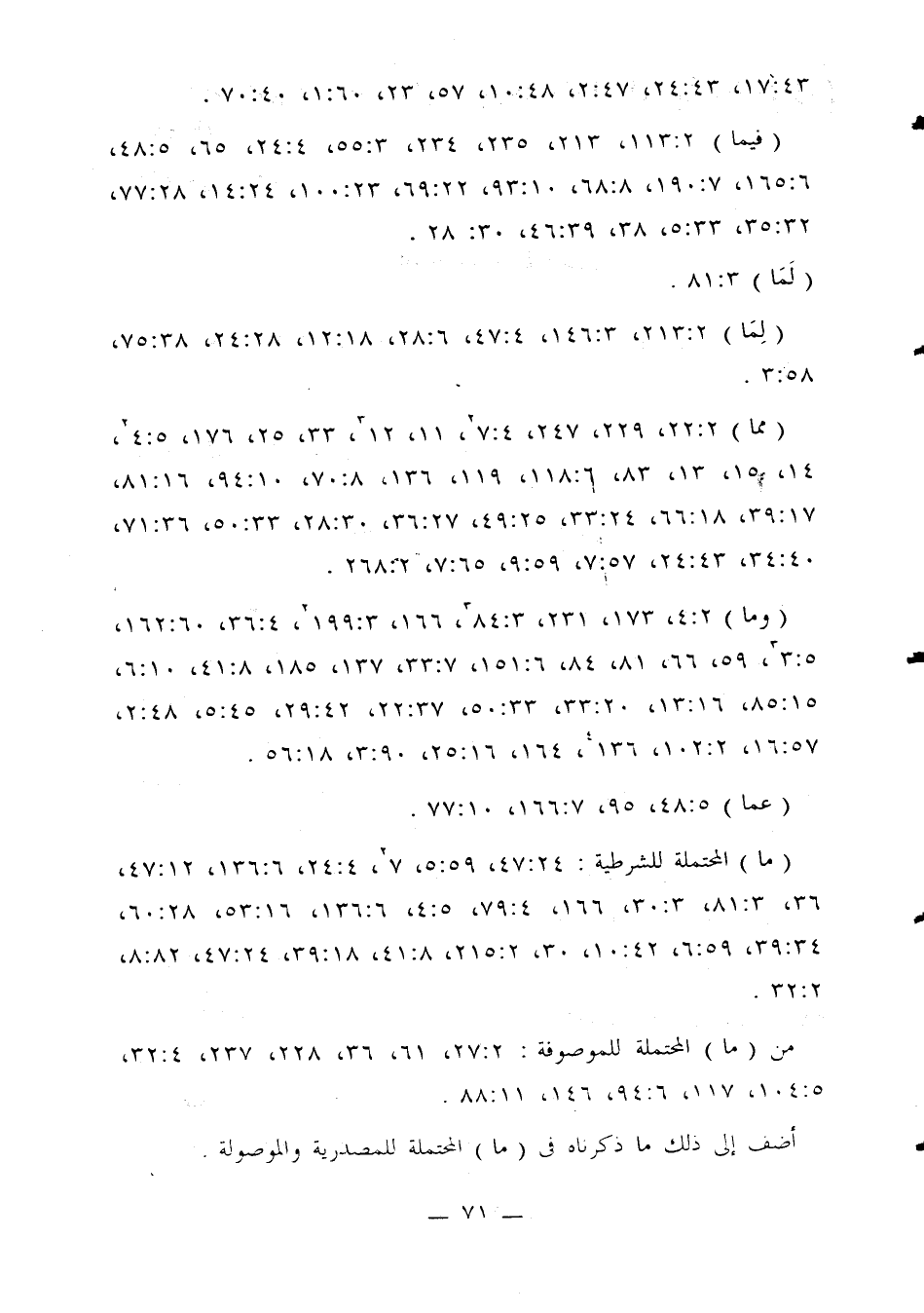(عما) المحتملة للشر طية: 24: 47، 59: 5، 7، 4: 24، 6: 136، 12: 47، 36، 3: 81، 3: 30، 166، 4: 79، 5: 4، 6: 136، 16: 53، 28: 60، 34: 39، 59: 6، 42: 10، 30، 2: 215، 8: 41، 18: 39، 24: 47، 82: 8، 2: 32.