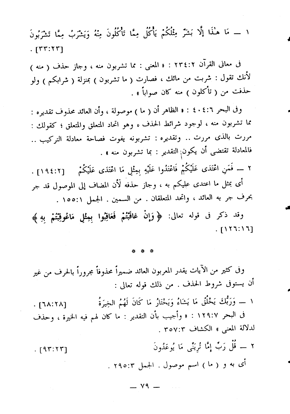 وفي كثير من الآيات يقدر المعربون العائد ضميرا محذوفا مجرورا بالحرف من غير أن يستوفى شروط الحذف. من ذلك قوله تعالى: