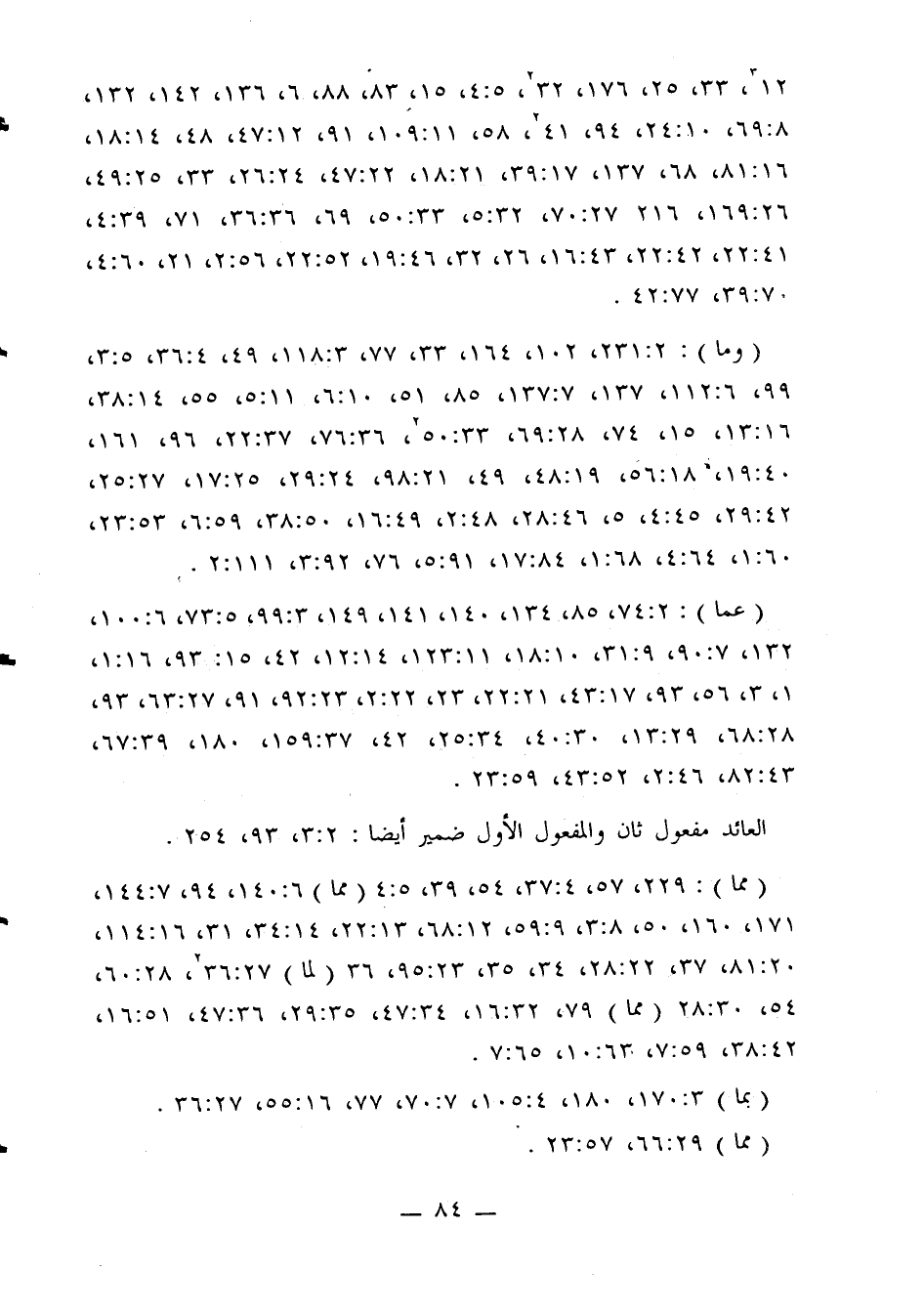 (وما) 2: 231، 102، 164، 33، 77، 3: 118، 49، 4: 36، 5: 3، 99، 6: 112، 137، 7: 137، 85، 51، 10: 6، 11: 5، 55، 14: 38، 16: 13، 15، 74، 28: 69، 33: 50، 36: 76، 37: 22، 96، 161، 40: 19، 18: 56، 19: 48، 49، 21: 98، 24: 29، 25: 17، 27: 25، 42: 29، 45: 4، 5، 46: 28، 48: 2، 49: 16، 50: 38، 59: 6، 53، 23، 60: 1، 64: 4، 68: 1، 84: 17، 91: 5، 76، 92: 3، 111: 2.