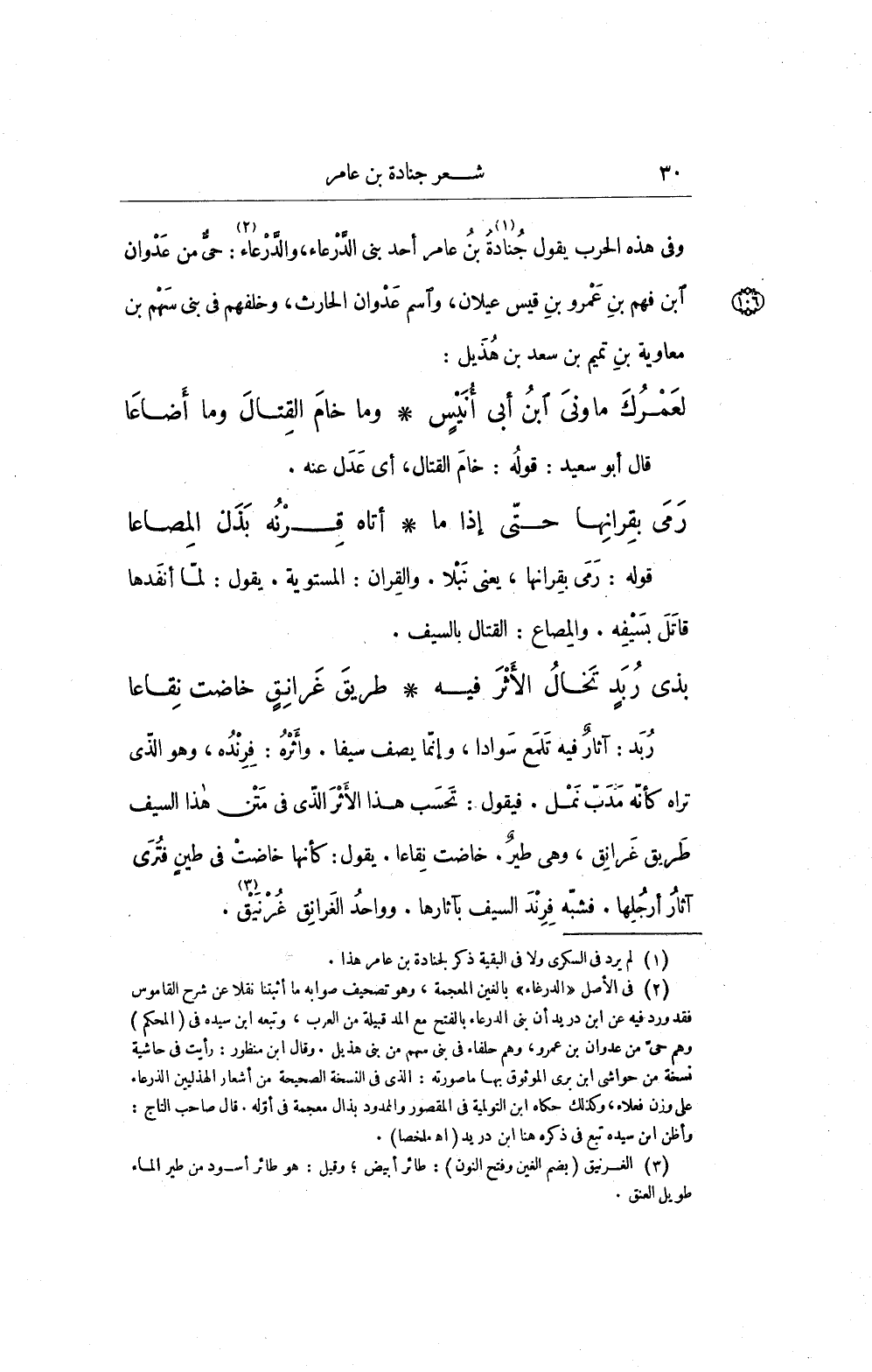 وفي هذه الحرب يقول جُنادةُ (¬1) بنُ عامر أحد بني الدَّرْعاء، والدَّرْعاء (¬2): حيٌّ من عَدْوان ابن فهم بنِ عَمْرو بن قيس عيلان، واسم عَدْوان الحارث، وخلفهم في بنى سَهْم بن معاوية فيِ تميم بن سعد بن هُذَيل: