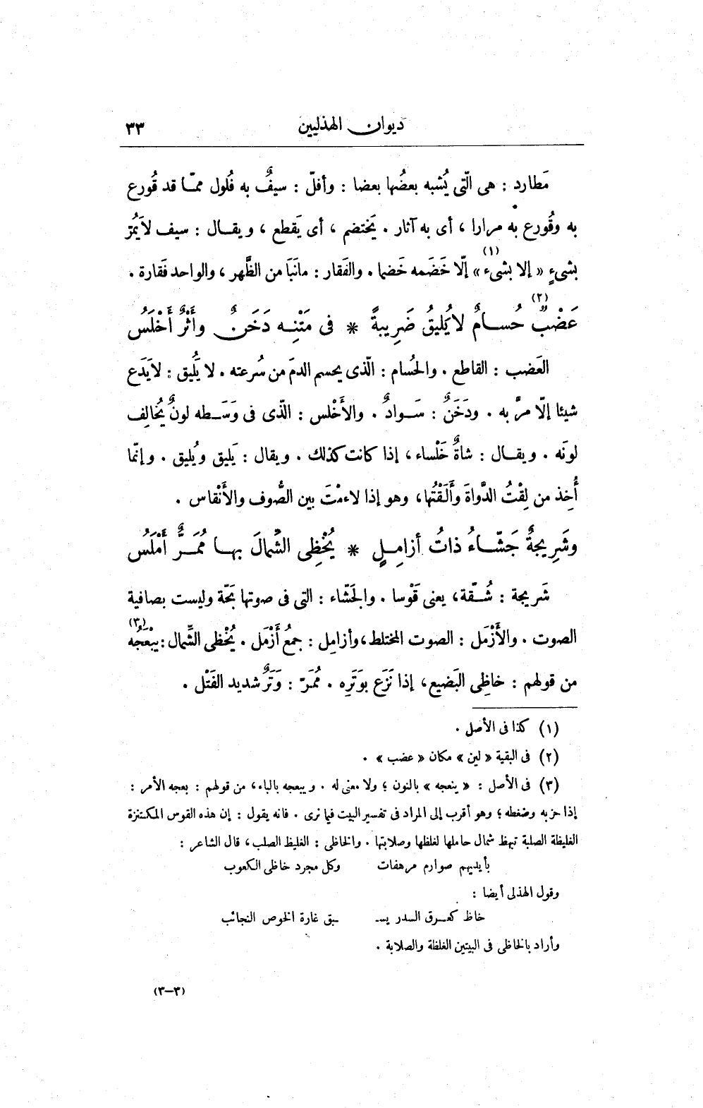 العَضب: القاطع. والحُسام: الّذى يحسم الدمَ من سُرعته. لا يليق: لا يَدَع شيئاً إلّا مرَّ به. ودَخَنٌ: سَوادٌ. والأَخْلس: الذّى في وَسَطه لونٌ يُخالِف لوَنه. ويقال: شاةٌ خَلْساء، إذا كانت كذلك. ويقال: يَليق ويُليق. وإنّما أُخِذ من لِقْتُ الدَّواةَ وأَلَقْتُها، وهو إذا لاءمْتَ بين الصُّوف والأَنْقاس.