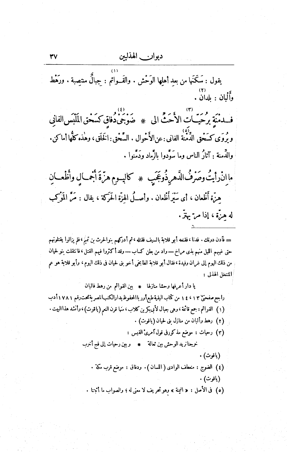 =فادن دونك. فدنا، فقنعه أبو قلابة بالسيف فقتله، ثم أدكهم بنو الحرث بن تميم، فلم يزالوا يقتلونهم حتى غيبهم الليل منهم بذى مراخ -واد من بطن كساب- وقد أكثروا فيهم القتل، فانتقلت بنو لحيان من ذلك اليوم إلى غران وفيدة، فقال أبو قلابة الطابخى أخو بنى لحيان في ذلك اليوم، وأبو قلابة هو عم المتنخل الهذلى: