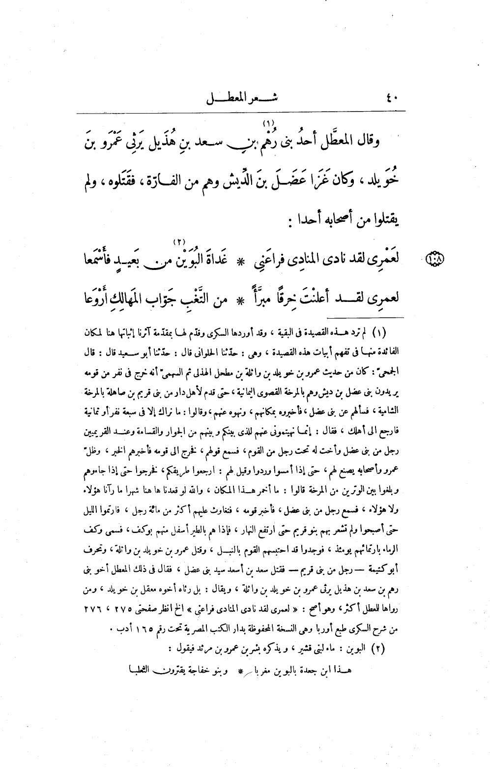 (¬1) لم ترد هذه القصيدة في البقية، وقد أوردها السكرى وقدّم لها بمقدّمة آثرنا إثباتها هنا لمكان الفائدة منها في تفهم أبيات هذه القصيدة، وهي: حدّثنا الحلوانى قال: حدّثنا أبو سعيد قال: قال الجمحىّ: كان من حديث عمرو بن خويلد بن واثلة بن مطحل الهذلى ثم السهمى أنه خرج في نفر من قومه يريدون بنى عضل بن ديش وهم بالمرخة القصوى اليمانية، حتى قدم لأهل دار من بنى قريم بن صاهلة بالمرخة الشامية، فسألهم عن بنى عضل، فأخبروه بمكانهم، ونهوه عنهم، وقالوا: ما نراك إلا في سبعة نفر أو ثمانية فأرجع إلى أهلك، فقال: إنما نهيتمونى عنهم للذى بينكم وبينهم من الجوار والقسامة وعند القريميين رجل من بنى عضل وأخت له تحت رجل من القوم، فسمع قولهم، فخرج إلى قومه فأخبرهم الخبر، وظلّ عمرو وأصحابه يصنع لهم، حتى إذا أمسوا وردوا وقيل لهم: ارجعوا طريقكم، فخرجوا حتى إذا جاءوهم وبلغوا بين الوترين من المرخة قالوا: ما أخمر هذا المكان، والله لو قعدنا ها هنا شهرا ما رآنا هؤلاء. ولا هؤلاء، فسمع رجل من بنى عضل، فأخبر قومه، فتغاوث عليهم أكثر من مائة رجل، فارتموا الليل حتى أصبحوا ولم تشعر بهم بنو قريم حتى ارتفع النهار، فإذا هم بالطير أسفل منهم بوكف، فسمى وكف الرماء بارتمائهم يومئذ، فوجدوا قد احتبسهم القوم بالنبل، وقتل عمرو بن خويلد بن واثلة، وتحرف أبو كتيمة -رجل من بنى قريم- فقتل سعد بن أسعد سيد بني عضل، فقال في ذلك المعطل أخو بنى رهم بن سعد بن هذيل يرثى عمرو بن خويلد بن واثلة، ويقال: بل رثاه أخوه معقل بن خويلد، ومن رواها للمعطل أكثر، وهو أصح: "لعمرى لقد نادى المنادى فراعني" الخ انظر صفحتى 275، 276 من شرح السكرى طبع أوربا وهي النسخة المحفوظة بدار الكتب المصرية تحت رقم 165 أدب.