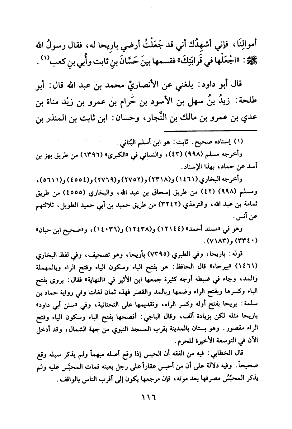 أموالِنَا، فإني أشهِدُك أني قد جَعَلتُ أرضي بارِيحا له، فقال رسولُ الله - صلَّى الله عليه وسلم -: "اجعَلْها في قَرابَتِك" فقسمها بينَ حَسَّانَ بنِ ثابت وأُبي بنِ كعب (¬١).