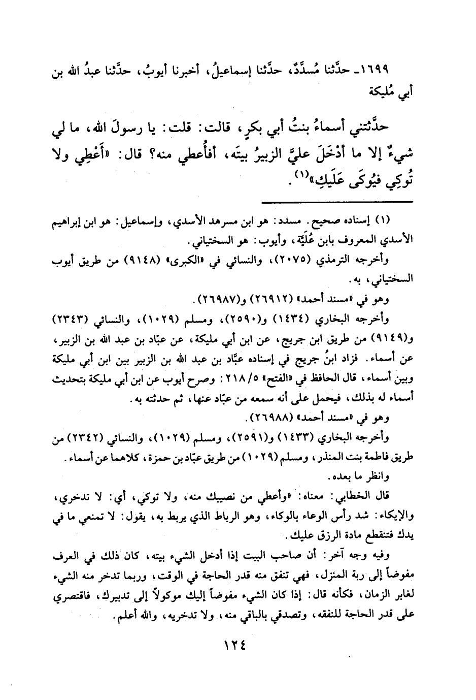 حدَّثتني أسماءُ بنتُ أبي بكرِ، قالت: قلت: يا رسولَ الله، ما لي شيء إلا ما أدْخَلَ علىَّ الزبيرُ بيتَه، أفأُعطي منه؟ قال: "أَعْطِي ولا تُوكِي فيُوكَى عَلَيكِ" (¬١).