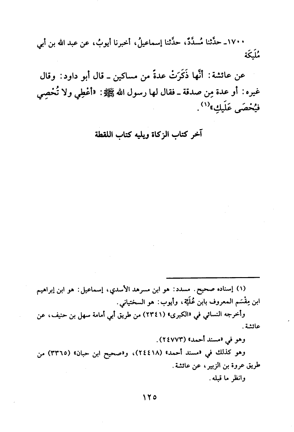 ١٧٠٠ - حدَّثنا مُسدَّدٌ، حدَّثنا إسماعيلُ، أخبرنا أيوبُ، عن عبد الله بن أبي مُلَيكَة
