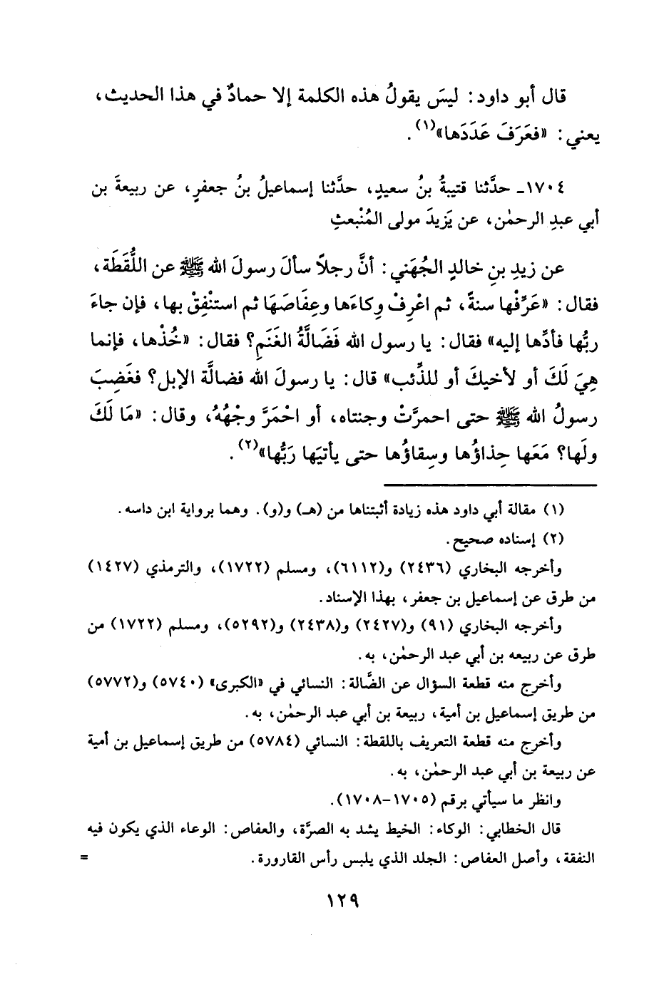 عن زيدِ بنِ خالدِ الجُهَني: أنَّ رجلاً سألَ رسولَ الله - صلَّى الله عليه وسلم - عن اللُّقَطَة، فقال: "عَرِّفها سنةً، ثم اعْرِف وِكاءَها وعِفَاصَهَا ثم استنْفِقْ بها، فإن جاءَ ربُّها فأدِّها إليه" فقال: يا رسول الله فَضَالَّةُ الغَنَمِ؟ فقال: "خُذْها، فإنما هِيَ لَكَ أو لأخيِكَ أو للذِّئب" قال: يا رسولَ الله فضالَّة الإبل؟ فغَضِبَ رسولُ الله - صلَّى الله عليه وسلم - حتى احمرَّتْ وجنتاه، أو احْمَرَّ وجْهُهُ، وقال: "مَا لَكَ ولَها؟ مَعَها حِذاؤُها وسِقاؤُها حتى يأتيَها رَبُّها" (¬٢).