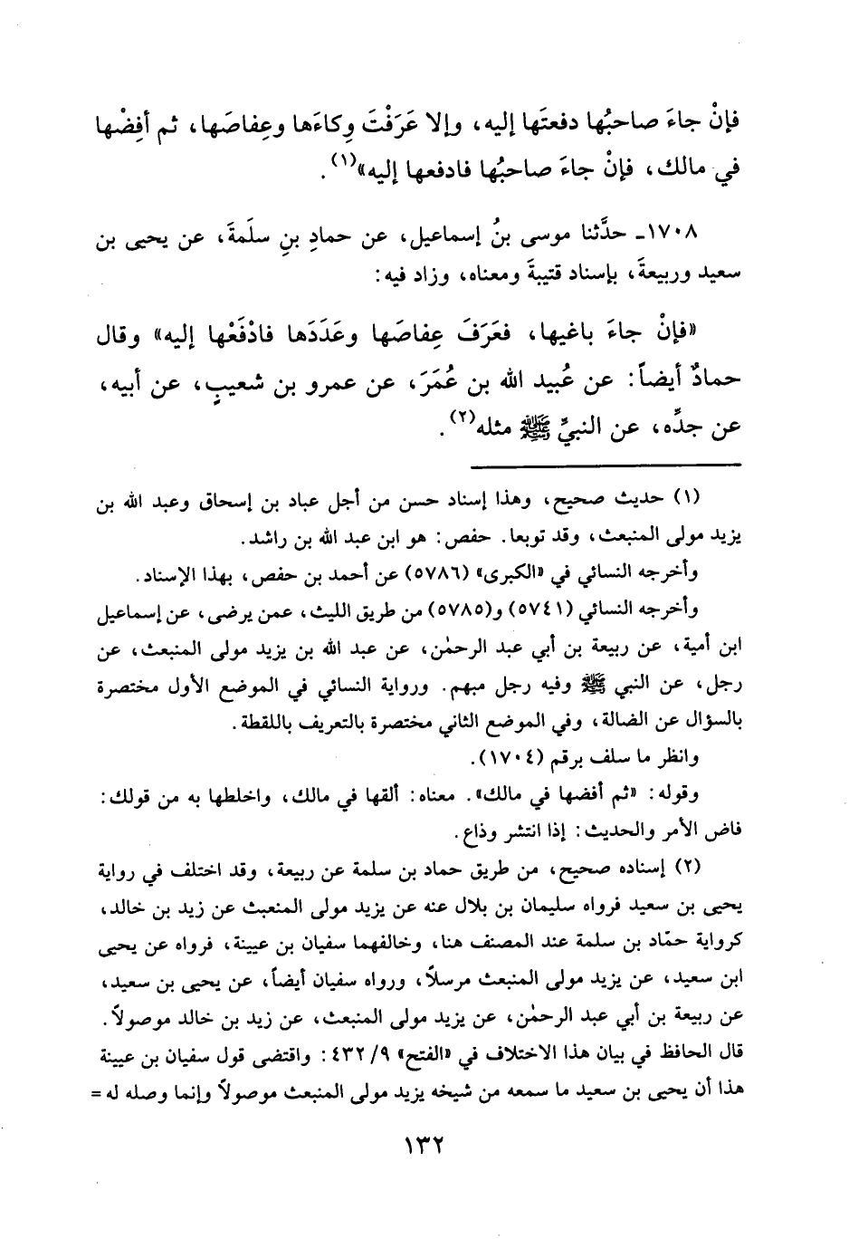 "فإنْ جاءَ باغيها، فعَرَفَ عِفاصَها وعَدَدَها فادْفَعْها إليه" وقال حمادٌ أيضاً: عن عُبيد الله بن عُمَرَ، عن عمرو بن شعيبٍ، عن أبيه، عن جدِّه، عن النبيَّ - صلَّى الله عليه وسلم - مثله (¬٢).