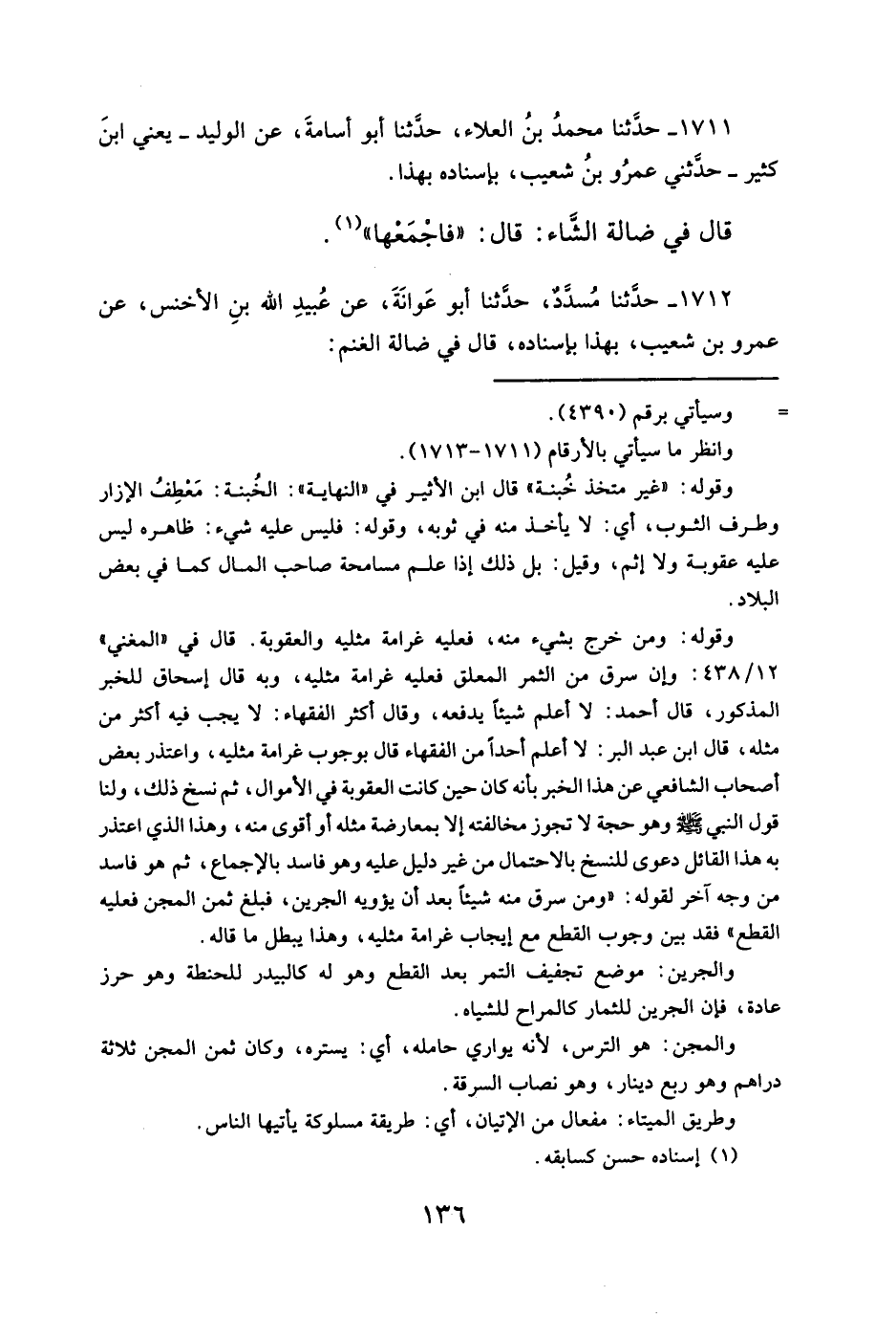 ١٧١٢ - حدَّثنا مُسدَّدٌ، حدَّثنا أبو عَوانَةَ، عن عُبيدِ الله بنِ الأخنس، عن عمرو بن شعيب، بهذا بإسناده، قال في ضالة الغنم:
