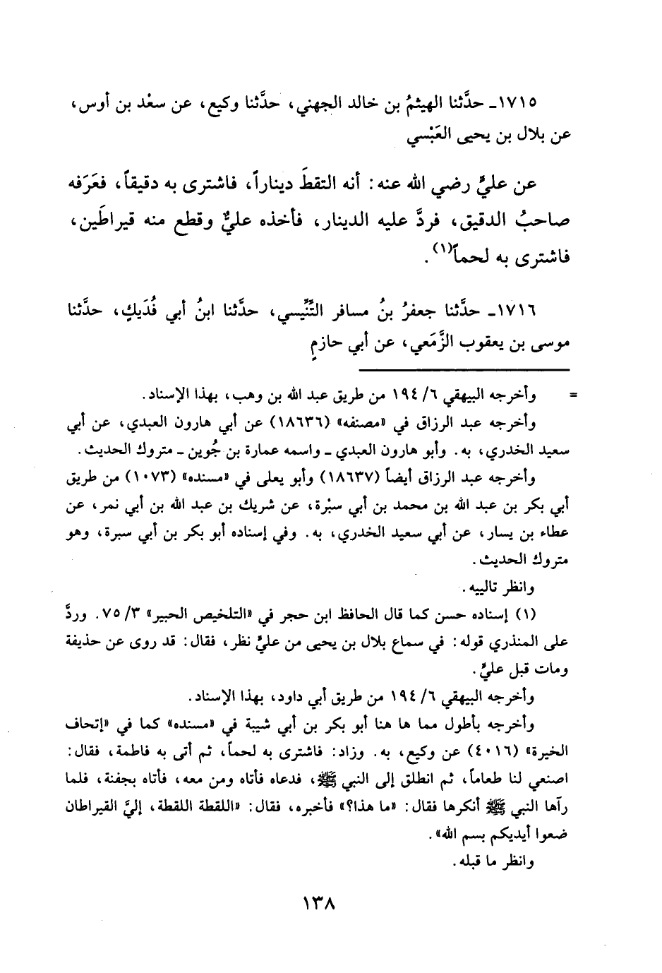 عن عليٍّ رضي الله عنه: أنه التقطَ ديناراً، فاشترى به دقيقاً، فعَرَفه صاحبُ الدقيق، فردَّ عليه الدينار، فأخذه علىّ وقطع منه قيراطَين، فاشترى به لحماً (¬١).
