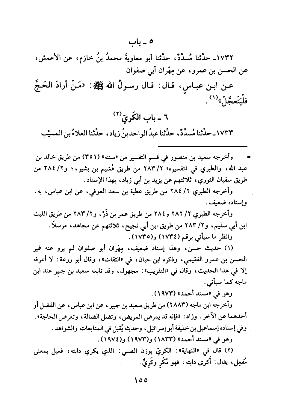 ١٧٣٣ - حدَّثنا مُسدَّد، حدَّثنا عبدُ الواحد بنُ زياد، حدَّثنا العلاءُ بن المسيِّب